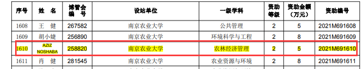 近期, 根据《中国博士后科学基金资助规定》(中博基字〔2020〕7号)文件精神,中国博士后科学基金第69批面上资助获资助人员名单公布。beat365官网农林经济管理博士后AZIZ NOSHABA喜获中国博士后科学基金第69批面上资助。