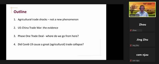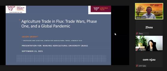 2021年9月16日上午,美国弗吉尼亚理工大学Jason H. Grant教授通过线上会议的形式为beat365官网师生做题为《Agriculture Trade in Flux: Trade Wars, Phase One, and a Global Pandemic》的报告。报告会由经管院院长朱晶教授主持,学院师生代表60余人参加了报告会。