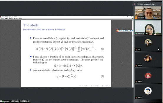 污染避风港是将国际贸易与环境联系起来的研究中心概念。与之相关的两个经济主题是污染港假说(Pollution Haven Effect)及其先决条件,即污染港效应(Pollution Haven Hypothesis)。具体而言,污染港效应认为一国环境法规的严格性转化为其比较优势,而污染港假说则认为贸易成本的降低导致污染密集型行业向环境监管相对薄弱的国家集中。段玉婉副教授本次汇报的主要内容便是自己针对这两个热点主题进行研究的文章。文章利用将污染排放作为生产副产品的一般贸易模型,定量评估这两个假说,结果证明,就算证实存在污染港效应,也并不支持污染港假说的成立。文章通过将环境政策严格程度与国际贸易的其他决定因素进行比较,认为生产力和贸易成本是抑制污染港效应的主要力量,同样也否定了污染港假说。此外,文章还认为战略环境政策不能有效替代贸易政策,但会带来严重的环境后果。如果没有国际协调与合作,即使各国的收入水平会提高,贸易成本的降低也会导致更多的全球污染排放。