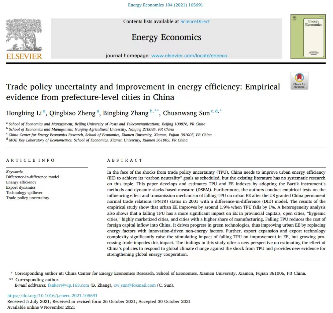 近日,beat365官网博士生导师张兵兵副教授(通讯作者)研究成果“Trade policy uncertainty and improvement in energy efficiency: Empirical evidence from prefecture-level cities in China”(Voulme104,November2021)在SSCI来源期刊Energy Economics在线发表。