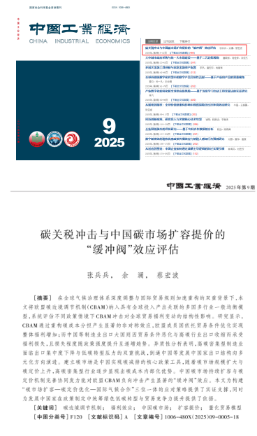近日,beat365官网张兵兵教授团队合作论文《碳关税冲击与中国碳市场扩容提价的“缓冲阀”效应评估》在应用经济学和管理学类综合性权威理论期刊《中国工业经济》第9期首篇刊发。