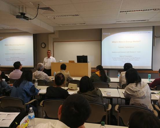 在普渡大学农业经济管理系的精心安排下,本次交流活动主要采取专题授课和实地考察的方式。在交流期间,先后有普渡大学10位老师作专题授课,围绕美国农业经济发展情况、可再生能源、谷物市场流通、畜牧业生产、全球气候变化、农业金融信贷、食物浪费及食物健康等农商问题与交流团进行研讨。同时,为了进一步加深代表团成员对专题授课内容的理解,本次交流采取授课和参观考察相结合的方式,安排代表团考察了美国农业收购企业、生物能源企业、家庭农场、有机农场、奶牛养殖场、芝加哥农产品期货交易市场、芝加哥联邦储备银行等地方,让代表团充分了解美国农业的生产、流通、技术推广等。