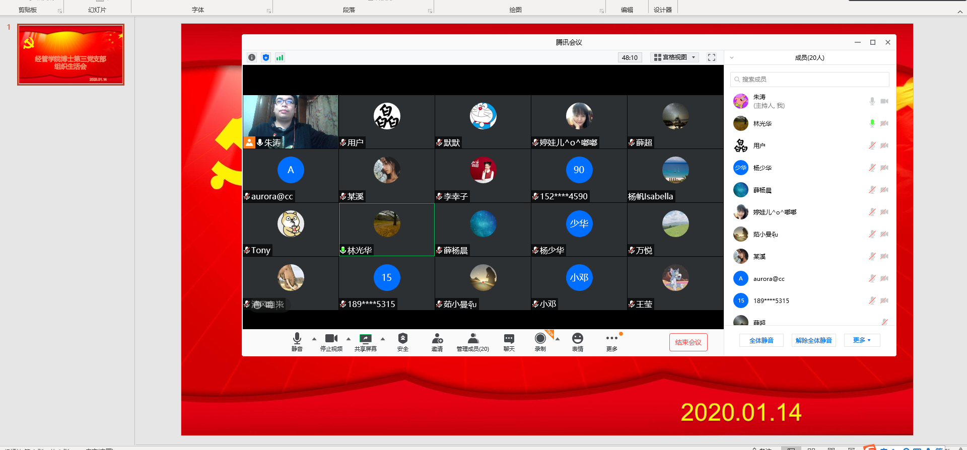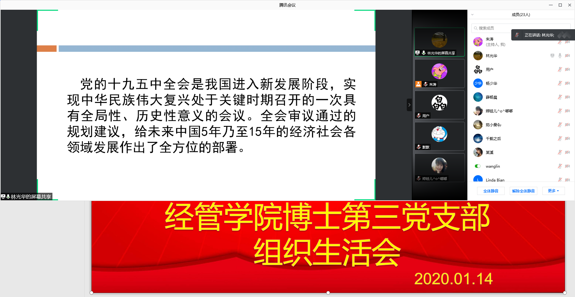 2021年1月14日下午2:00,博士研究生第三党支部组织召开线上主题党日,党委书记姜海、副书记宋俊峰、党委委员副院长林光华参会指导。党支部书记朱涛主持会议。
