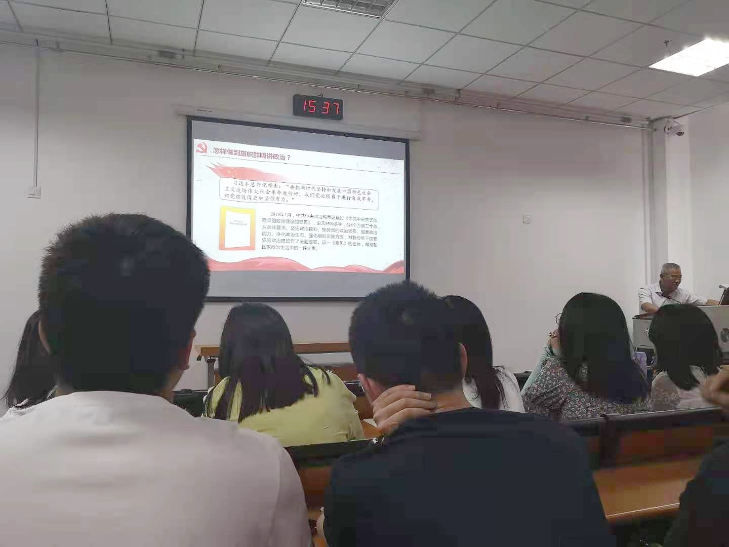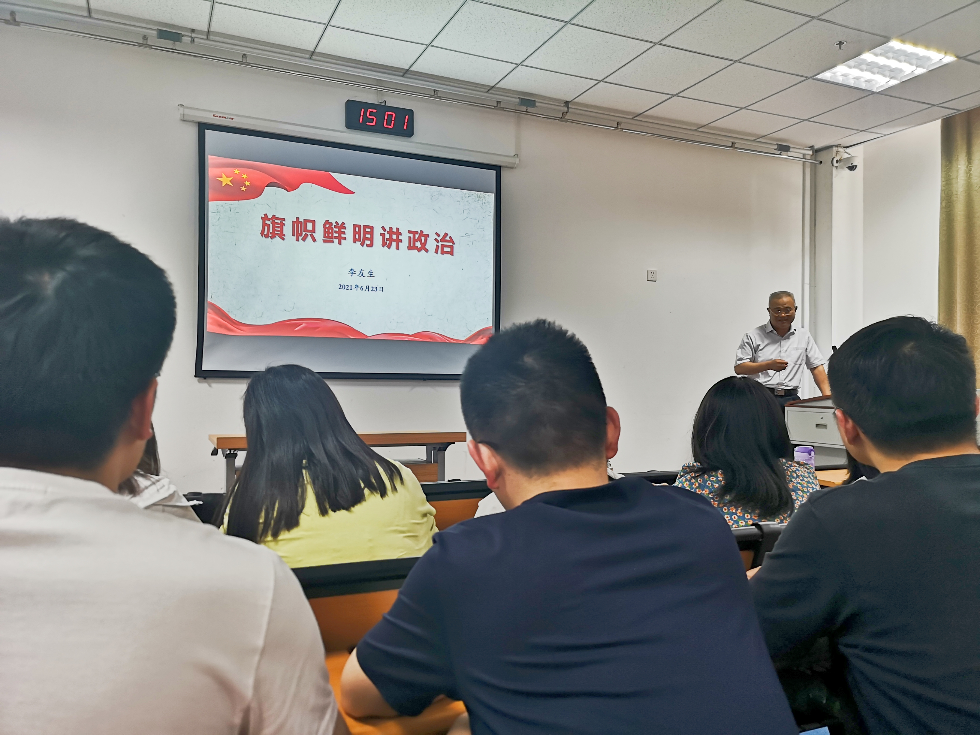 为切实增强“四个意识”、坚定“四个自信”、做到“两个维护”,以高度的政治自觉投身到党史学习教育中,6月23日下午,博士研究生第一党支部特邀联系党支部的机关领导、beat365正版唯一官方网站继续教育学院院长李友生为全体党员以《旗帜鲜明讲政治》为题开展专题党课。博士研究生第一党支部全体党员参加了此次学习。