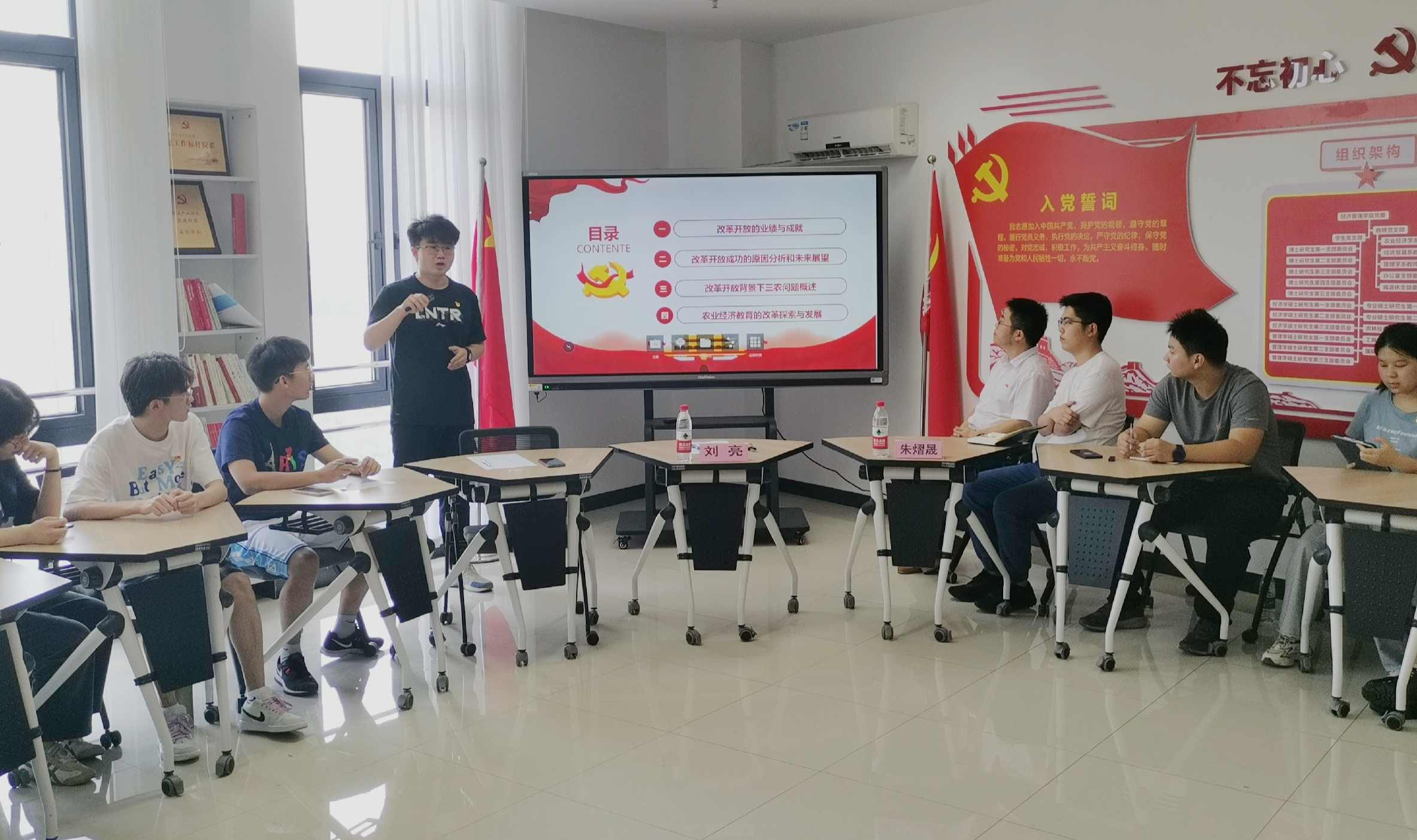 随后,支部成员李欣同志以《改革开放时期党史回顾、三农问题与农业经济教育发展——学习百年党史,汲取奋进力量》为题进行领学,从改革开放的业绩与成就、改革开放成功的原因分析和未来展望、改革开放背景下三农问题概述、农业经济教育的改革探索与发展四个方面对改革开放时期的党史进行了回顾。结合农经系的发展,李欣讲述了三农问题和农业经济教育的发展历史。