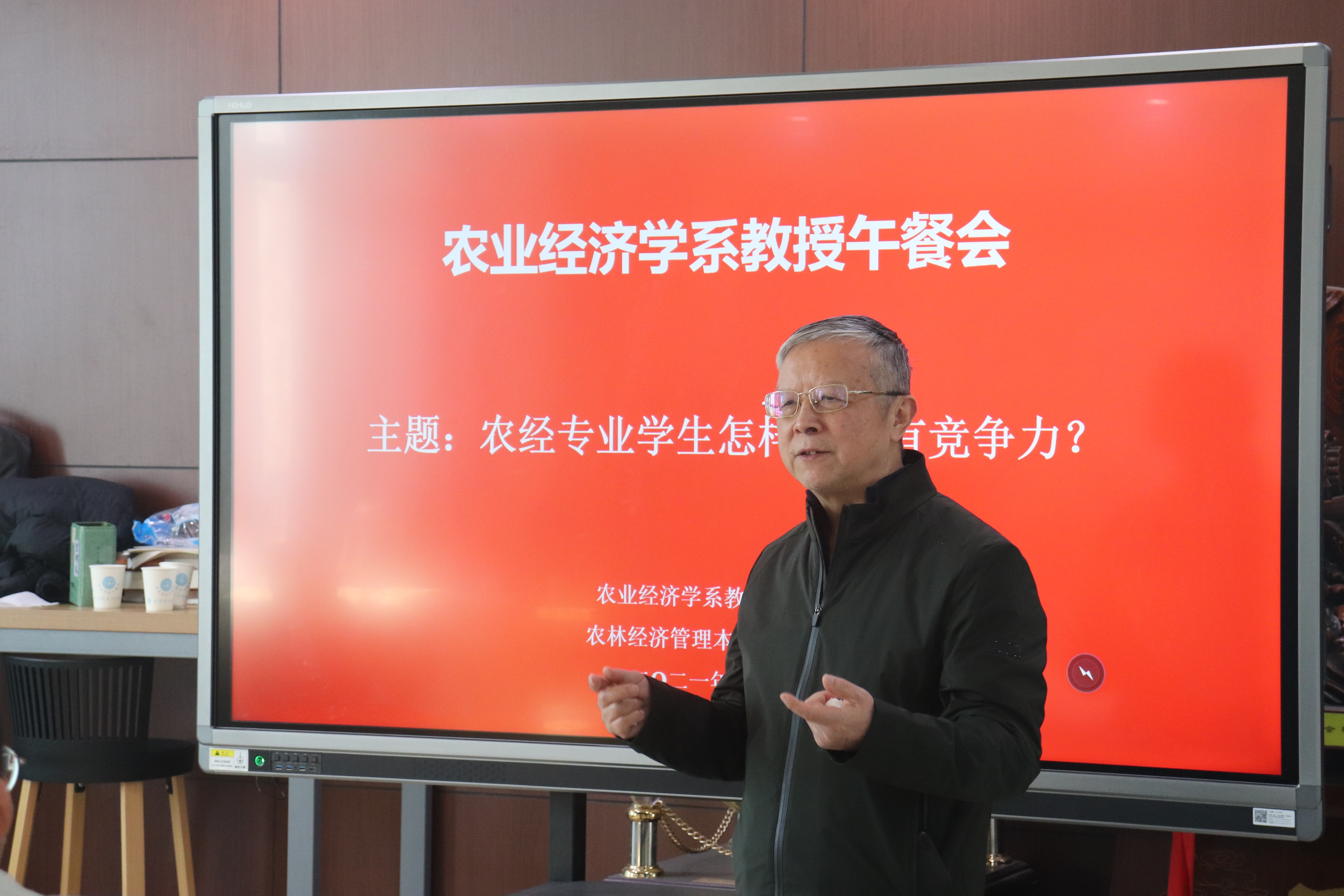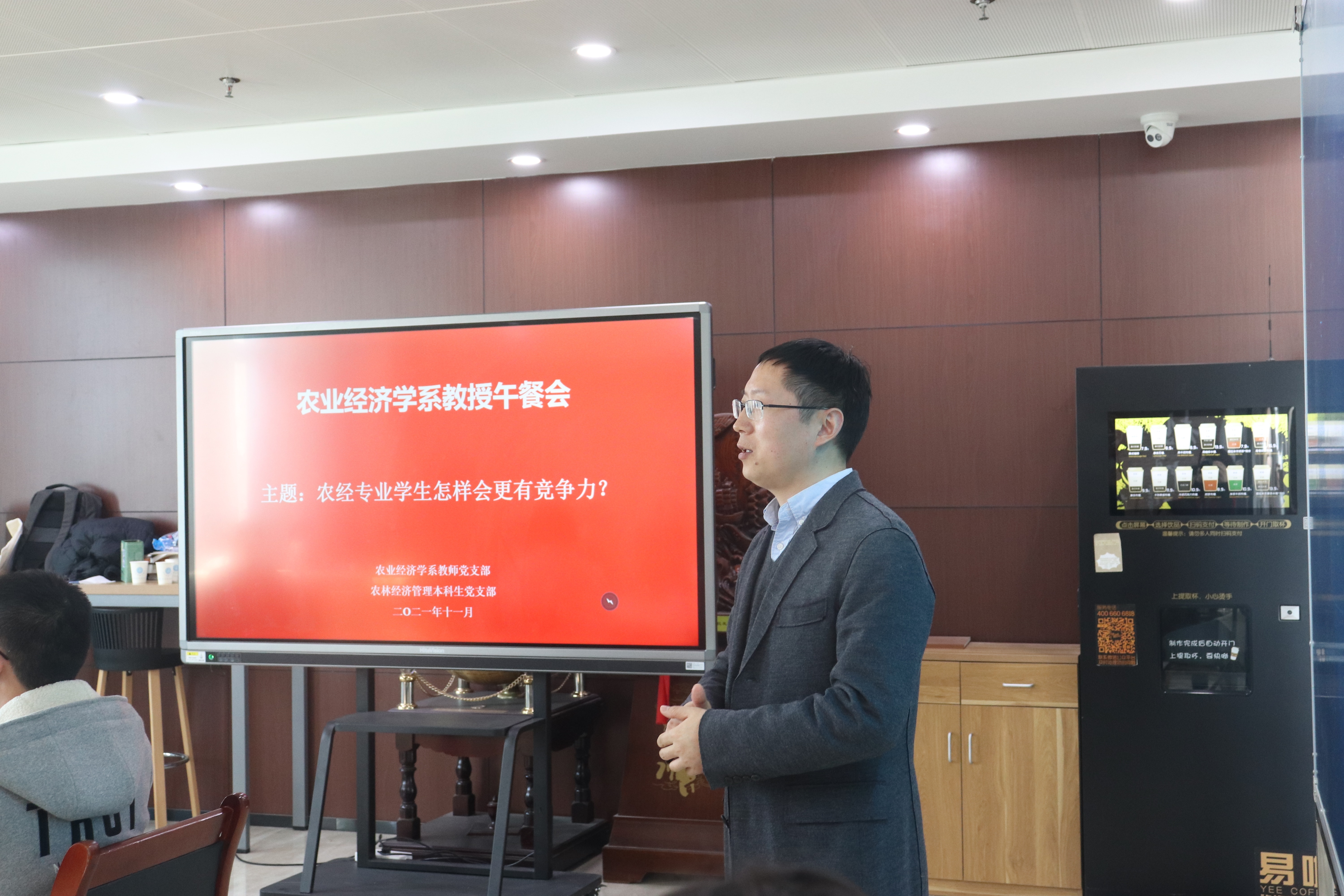 2021年11月24日,农业经济学系教师党支部组织“立德树人:教授—学生面对面午餐会”主题党日。活动在第三实验楼经管学院8楼开展,由系主任、党支部书记展进涛教授主持,农经系“江苏省社科名家”钟甫宁教授、副主任孙顶强教授、周德副教授、李天祥副教授、胡杨副教授等10位老师,农林经济管理专业本科生党支部20名同学集体参加。