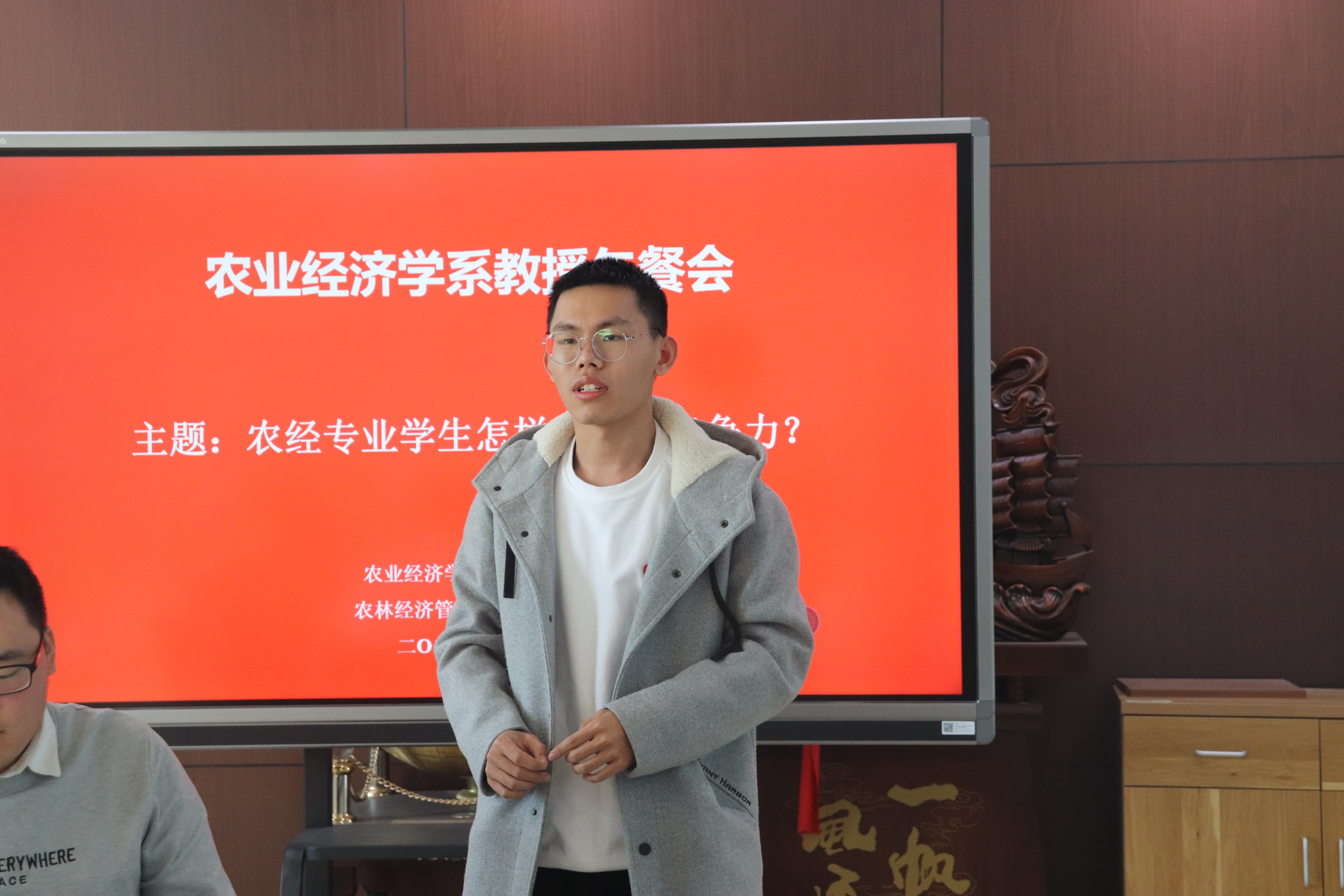 农经191班王圣柯同学感悟到:“大学是一个人成长发展的关键阶段,这期间免不了有迷茫困惑,需要前辈指点迷津。本次午餐会通过特别的方式搭建了我们与老师沟通的桥梁。在这种轻松愉悦的氛围下,我们敞开心扉,与老师进行了交流。继续深造还是工作,如何提高竞争力,遇到困难如何解决,老师们纷纷以自己的亲身经历现身说法,建议良多。与此同时,我更深刻认识到无论要在哪方面成为令人刮目相看的‘大牛’,其道路都是曲折漫长的。艰难困苦,玉汝于成,唯有秉持初心,坚定前行,方能领略别样的一番天地。”
