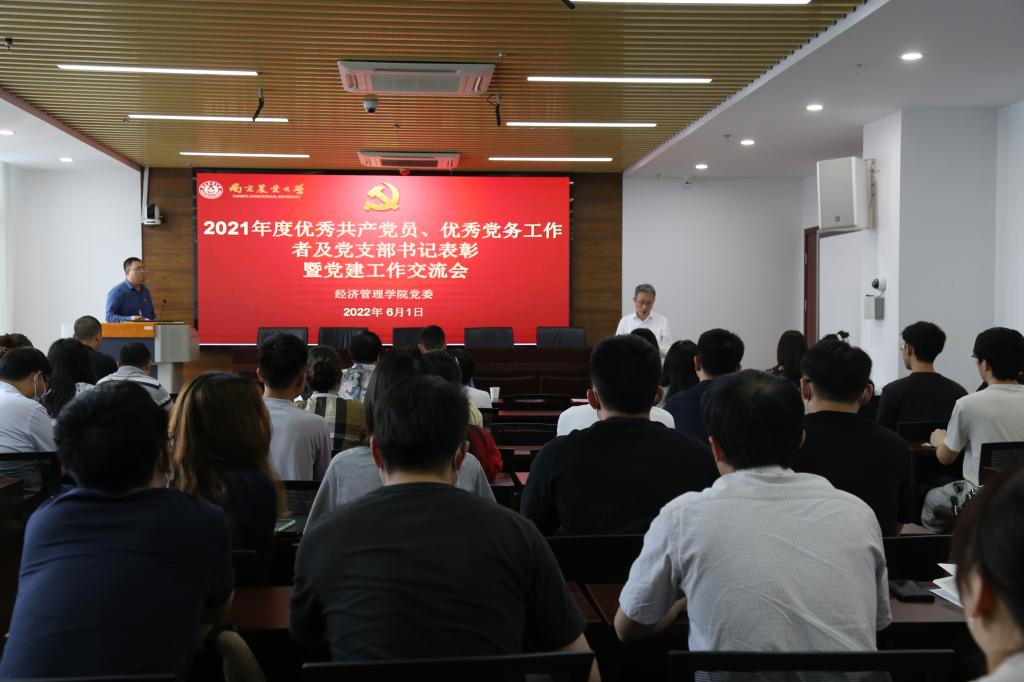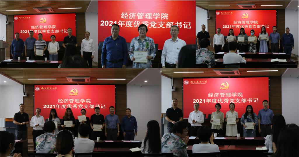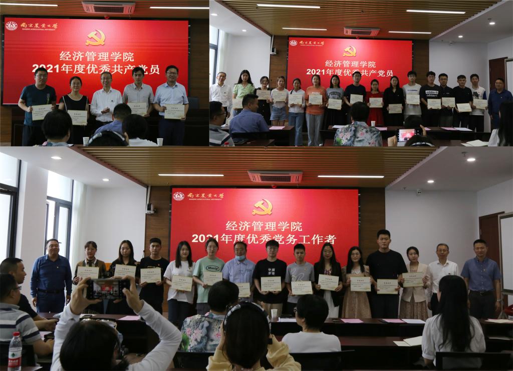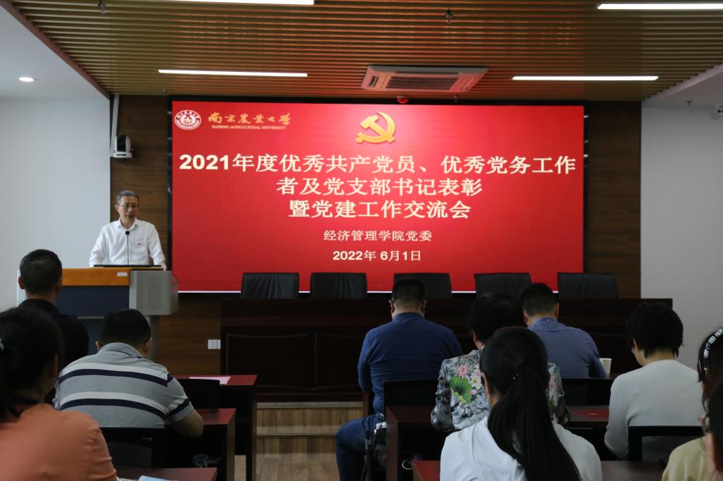 最后,姜海代表学院党委,受表彰的先进个人表示祝贺。2021年,学院入选校第二批党建工作标杆院系,获校七一“先进院级党组织”表彰,是全体党支部书记、党务工作者及师生党员共同努力的结果。党支部书记、党务工作者要对标看齐、对标争先,开展高度、有温度、有力度、有尺度、有深度的党建工作。全体党员要不忘专业初心、牢记时代使命,在干中学、在学中干,为一流学科建设和学院高质量发展作出应有贡献。