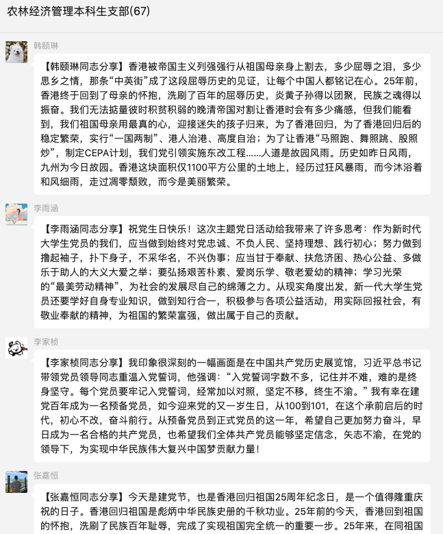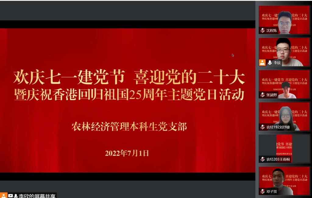 2022年7月1日,农林经济管理本科生党支部通过线上方式开展“欢庆七一建党节喜迎党的二十大暨庆祝香港回归祖国25周年”主题党日活动,全体党员参加了活动。