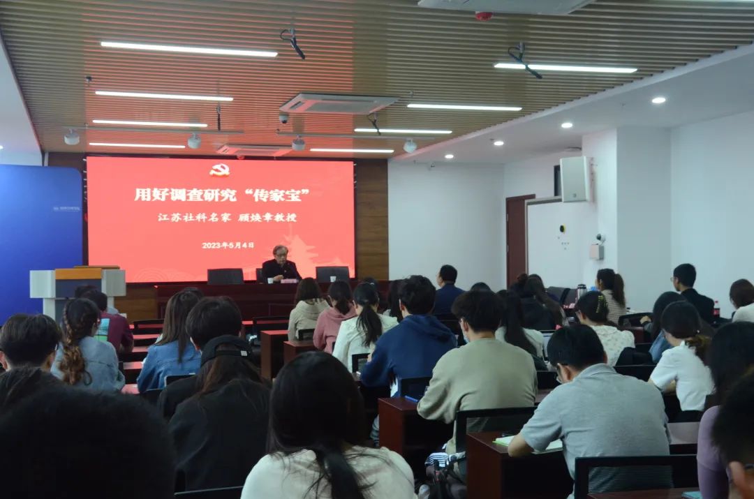 为全面深入贯彻落实党的二十大精神,高标准高质量开展学习贯彻习近平新时代中国特色社会主义思想主题教育,推动全院师生把调查研究作为谋事之基、成事之道,促进成果有效转化。2023年5月4日,beat365正版唯一官方网站党委开展学习贯彻习近平新时代中国特色社会主义思想主题教育读书班专题辅导会。江苏社科名家顾焕章教授作《用好调查研究“传家宝”》专题报告,学院党委委员、全体教职工和学生党支部书记、党员代表参加会议。会议由beat365正版唯一官方网站党委副书记宋俊峰主持。