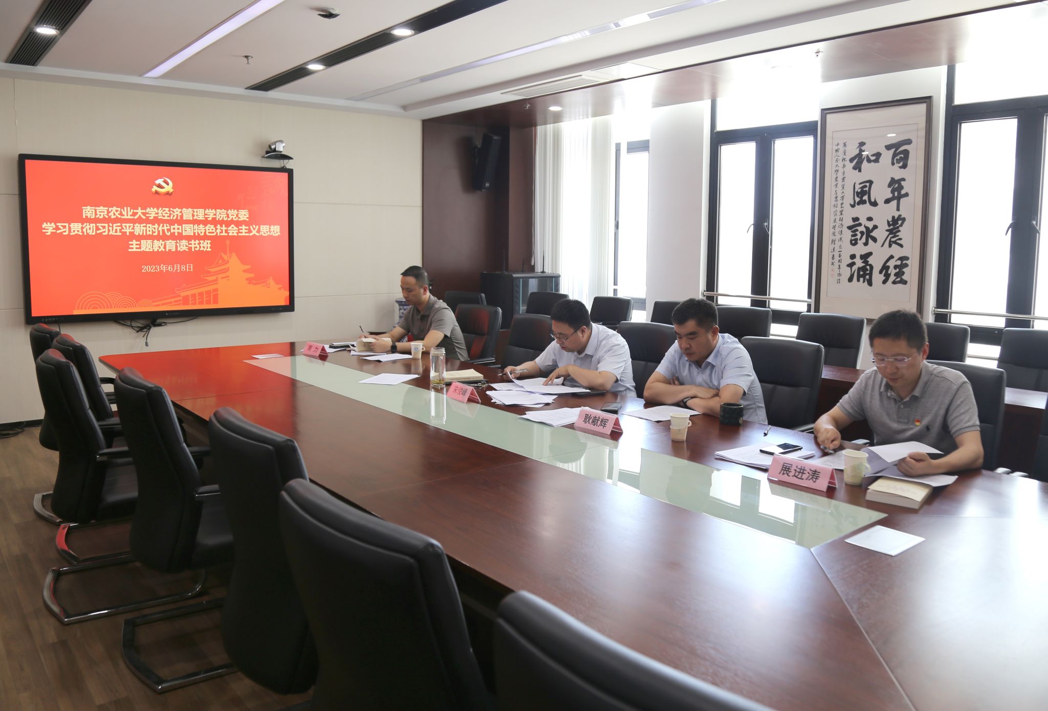 2023年6月8日下午,beat365正版唯一官方网站党委在第三实验楼716会议室开展主题教育读书班暨中心组专题学习。院党委副书记宋俊峰主持会议,党委委员耿献辉、周力、展进涛参加会议。