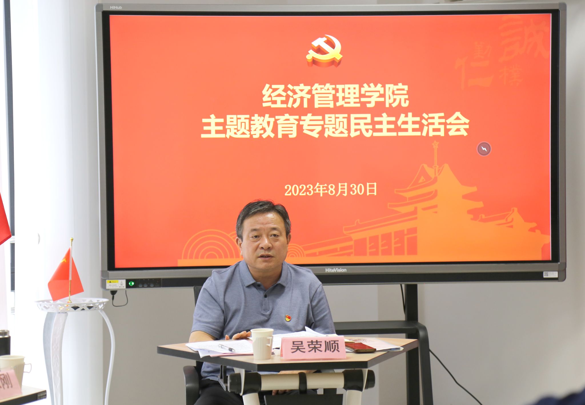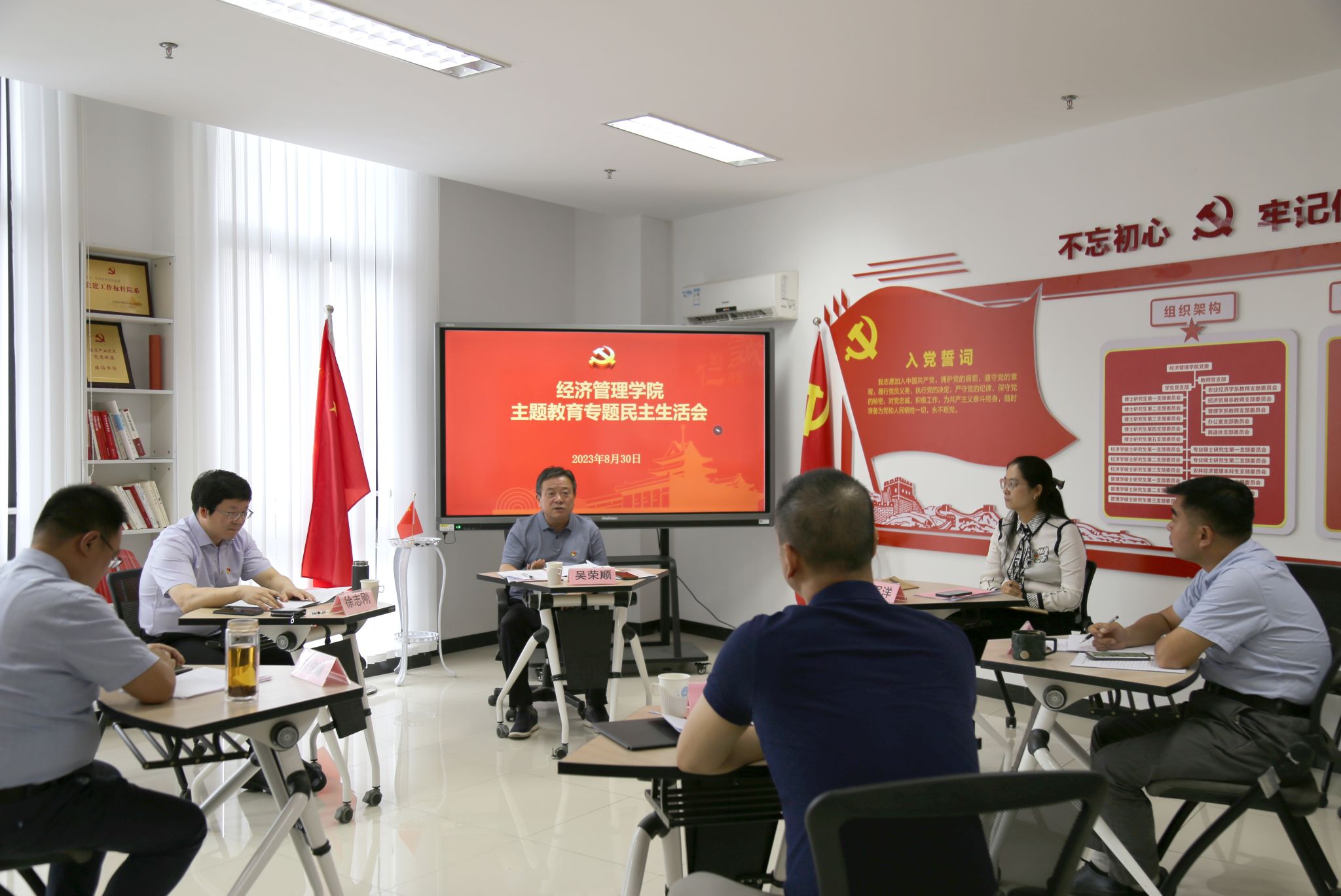 2023年8月30日,按照学校统一部署要求,beat365正版唯一官方网站召开学习贯彻习近平新时代中国特色社会主义思想主题教育专题民主生活会。校党委副书记、纪委书记吴荣顺到会指导,党委巡察办副主任郭军洋参会督导。院党委副书记、院长徐志刚主持会议,全体院领导班子成员参加会议。