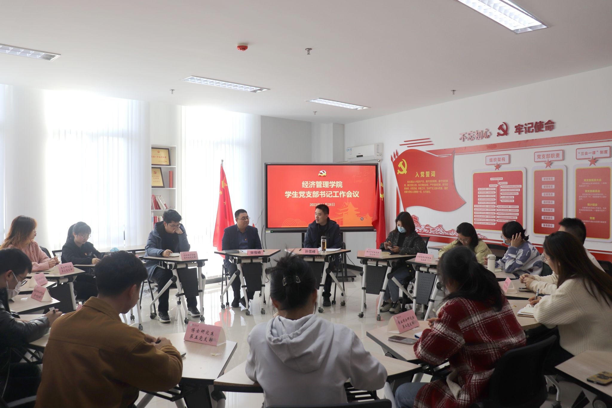 会上,孙雪峰对学院基层党组织建设、党员发展流程、党员档案管理等方面做了进一步整体要求。现场,孙雪峰还就学生党支部“三会一课”开展与大家做了交流探讨。
