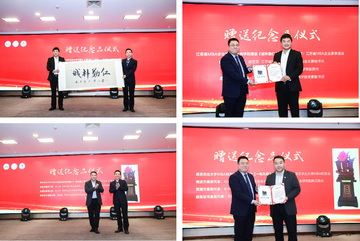 值南农MBA办学十周年之际,江苏省MBA企业家联谊会向学院赠送“诚朴勤仁”卷轴,南农MBA校友会向学院赠送“一帆风顺”摆件,赠送方代表胡亚军秘书长、刘兴龙会长,林光华副院长代表学院上台接受赠礼,宋俊峰副书记代表学院颁发赠送证书。
