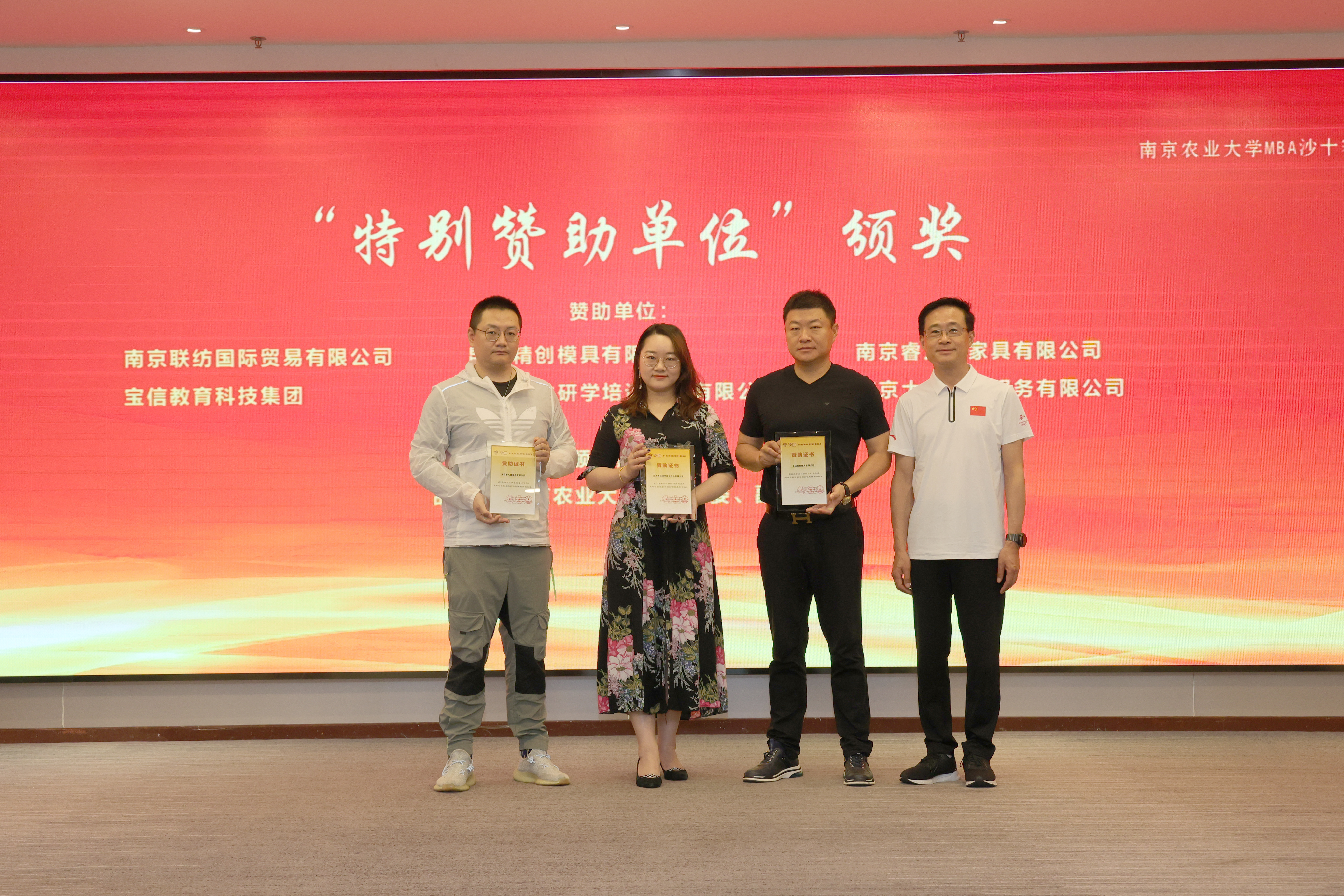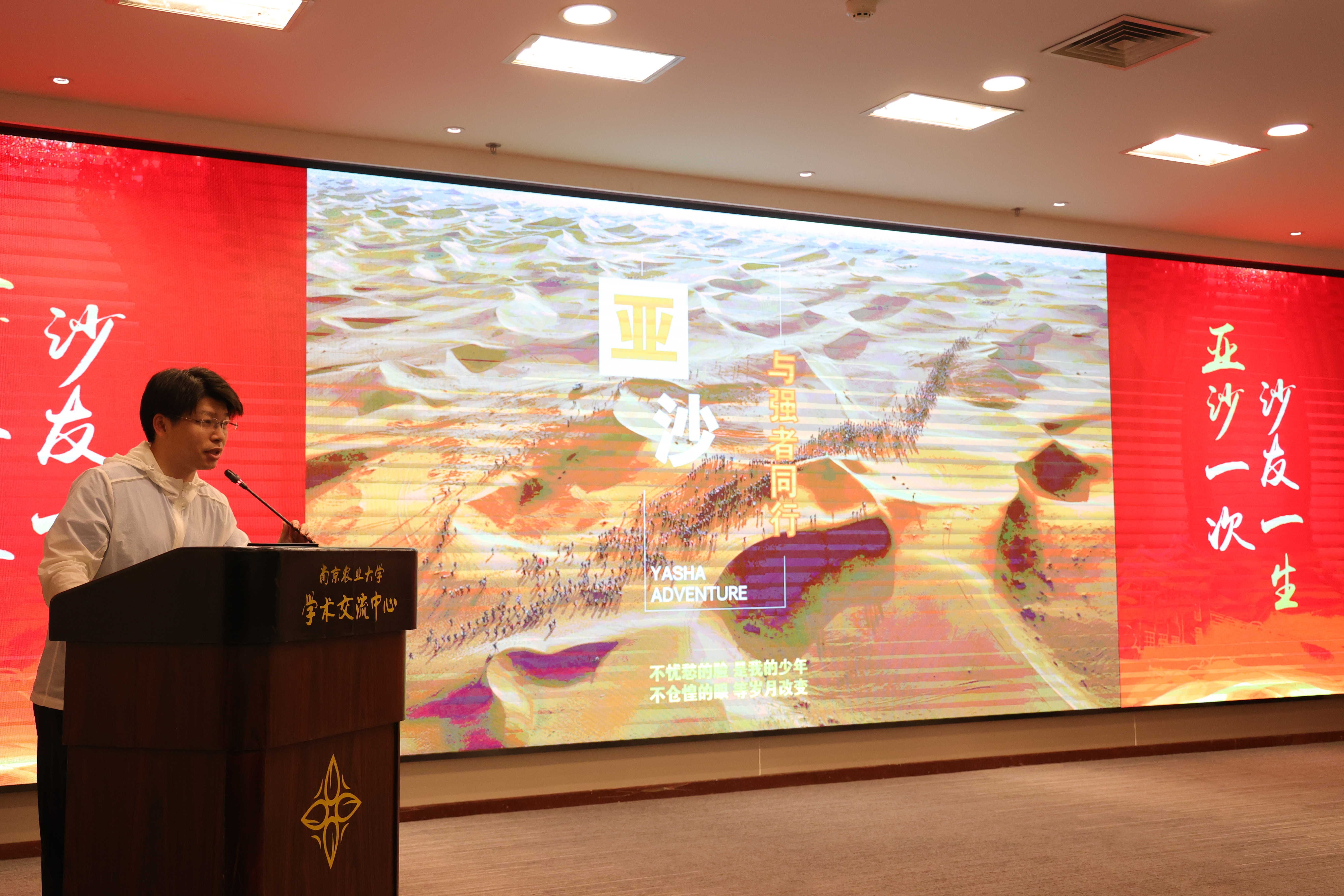 在沙11启动仪式上,沙10领队、2020级MBA学员杨自龙,沙11领队、2021级MBA学员王剑在联合会主席沈超的见证下完成了南农“沙漠绿洲队”队旗的交接。