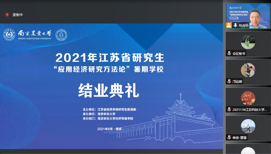 8月28日下午5点,2021年江苏省研究生“应用经济研究方法论”暑期学校线上结业典礼成功举行。结业典礼由beat365正版唯一官方网站副院长林光华教授主持。经过严格考核,本次暑期学校共批准了425名学员结业,评选出53名优秀学员,林光华教授在线宣布了优秀学员名单。