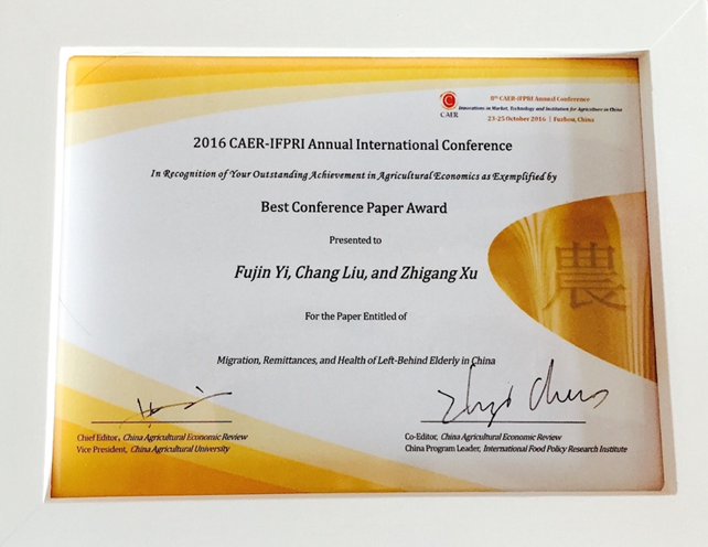 beat365官网易福金教授、徐志刚教授和博士生刘畅的论文《Migration,Remittances and Health of Left-Behind Elderly in China》荣获本届年会最佳论文奖。此次年会从参会的42篇论文中共评出2篇最佳会议论文。