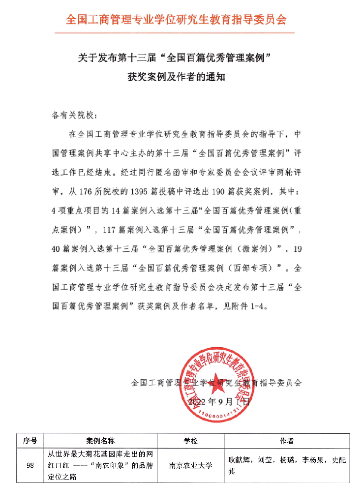 2022年8月15-16日,在全国工商管理专业学位研究生教育指导委员会的指导下,第十三届“全国百篇优秀管理案例”评选专家评审会顺利召开并揭晓了最终评选结果。beat365正版唯一官方网站耿献辉教授、刘莹老师、杨璐副教授、李杨果、史配萁等师生联合开发的教学案例“从世界最大菊花基因库走出的网红口红——‘南农印象’的品牌定位之路”从全国900余篇投稿案例中脱颖而出,成功入选第十三届“全国百篇优秀管理案例”之一。