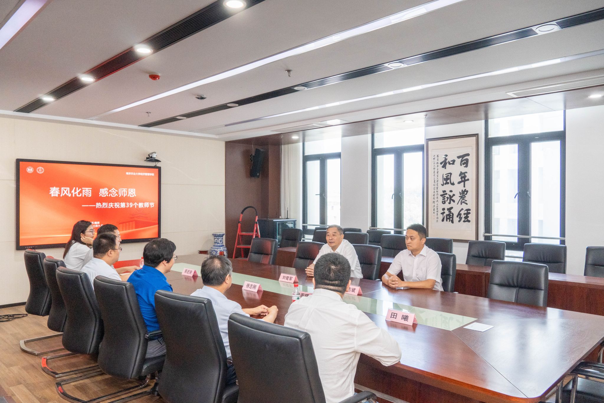 在第39个教师节来临之际,校党委副书记刘营军一行来到学院,为教师代表周曙东教授、展进涛教授、田曦教授、杨璐副教授送上鲜花,与他们进行座谈交流,向学院全体教职员工致以节日的祝福。院长徐志刚、院党委副书记宋俊峰出席座谈会。