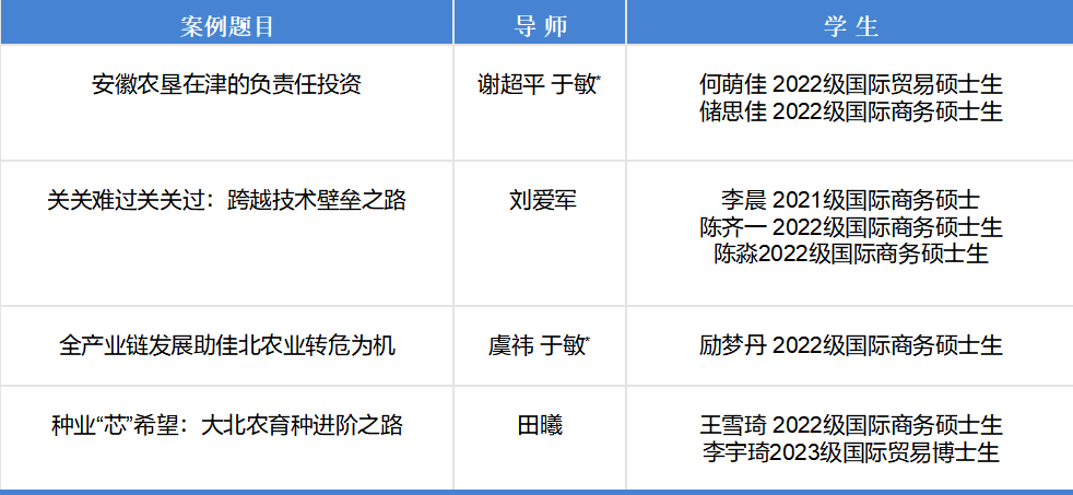 beat365官网入选的4篇案例分别由谢超平副教授、刘爱军副教授、虞祎副教授与田曦教授指导。4篇案例紧密围绕我国农业企业的国际化模式开展了深入研究,充分体现了beat365官网国际商务专业的特色与优势,是beat365官网国际商务专业人才培养的重要阶段性成果。