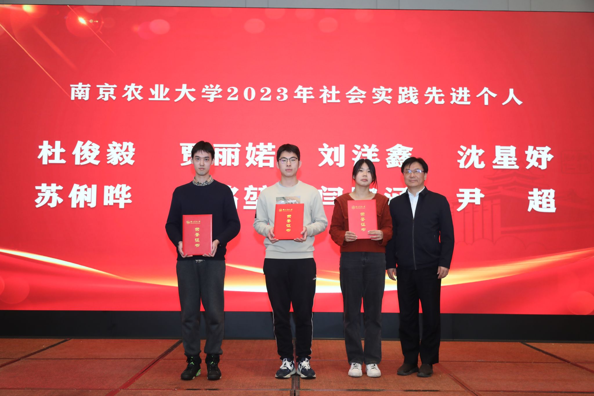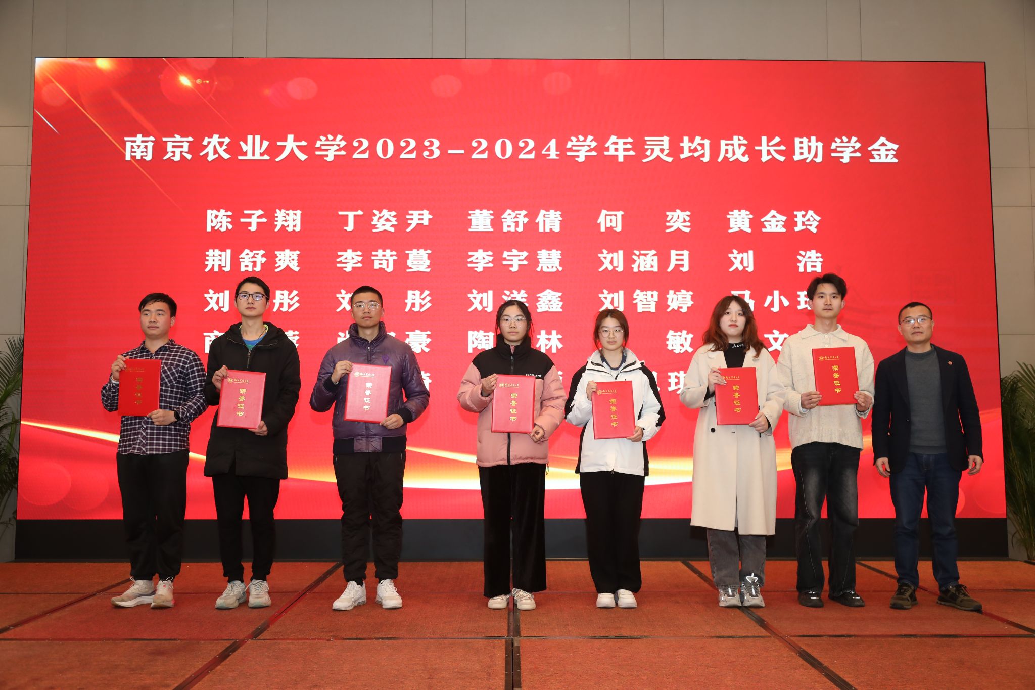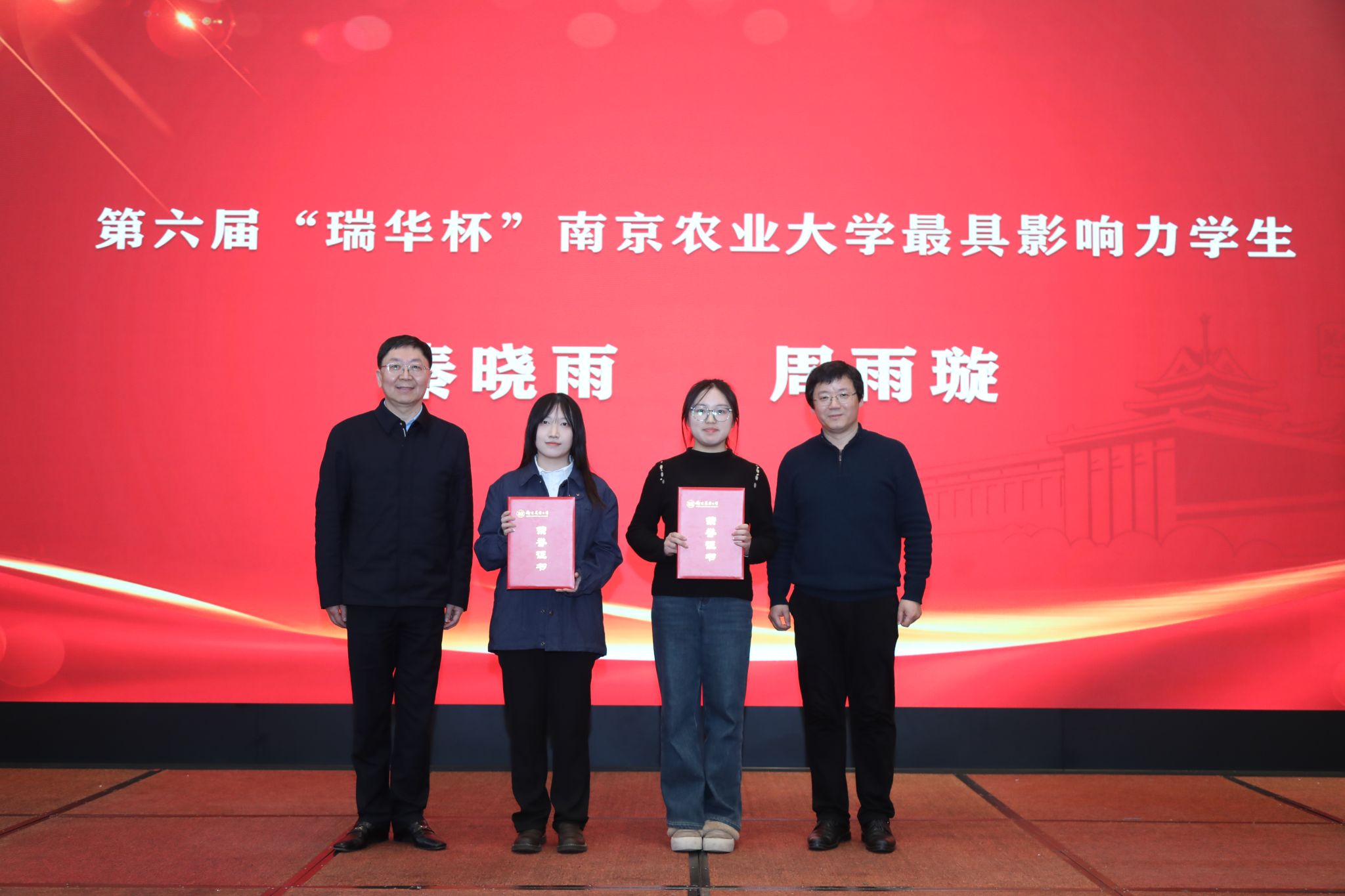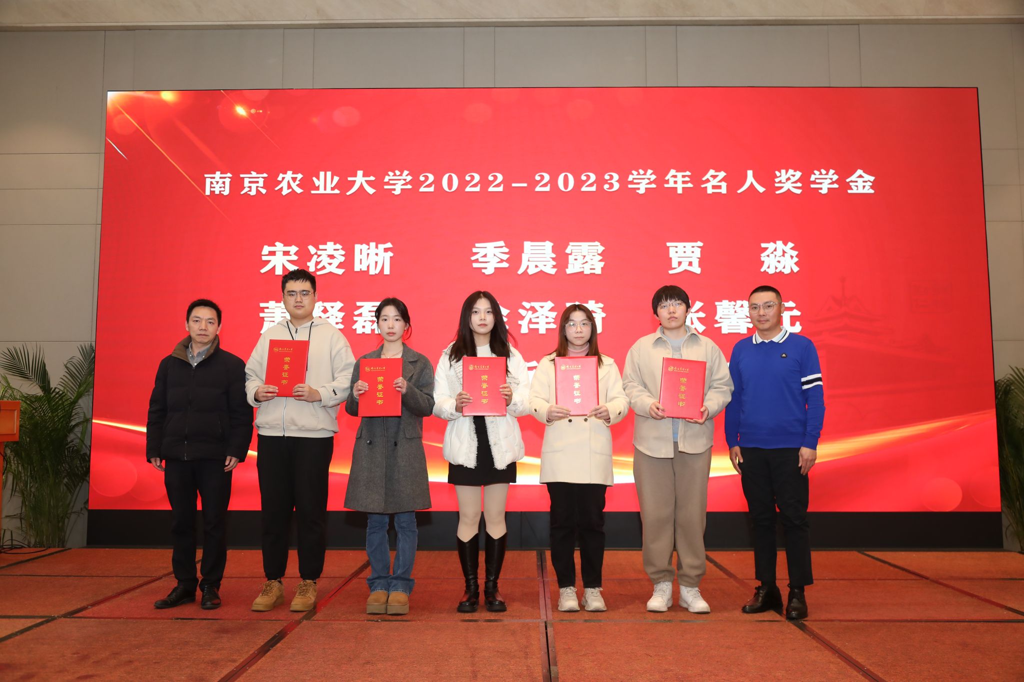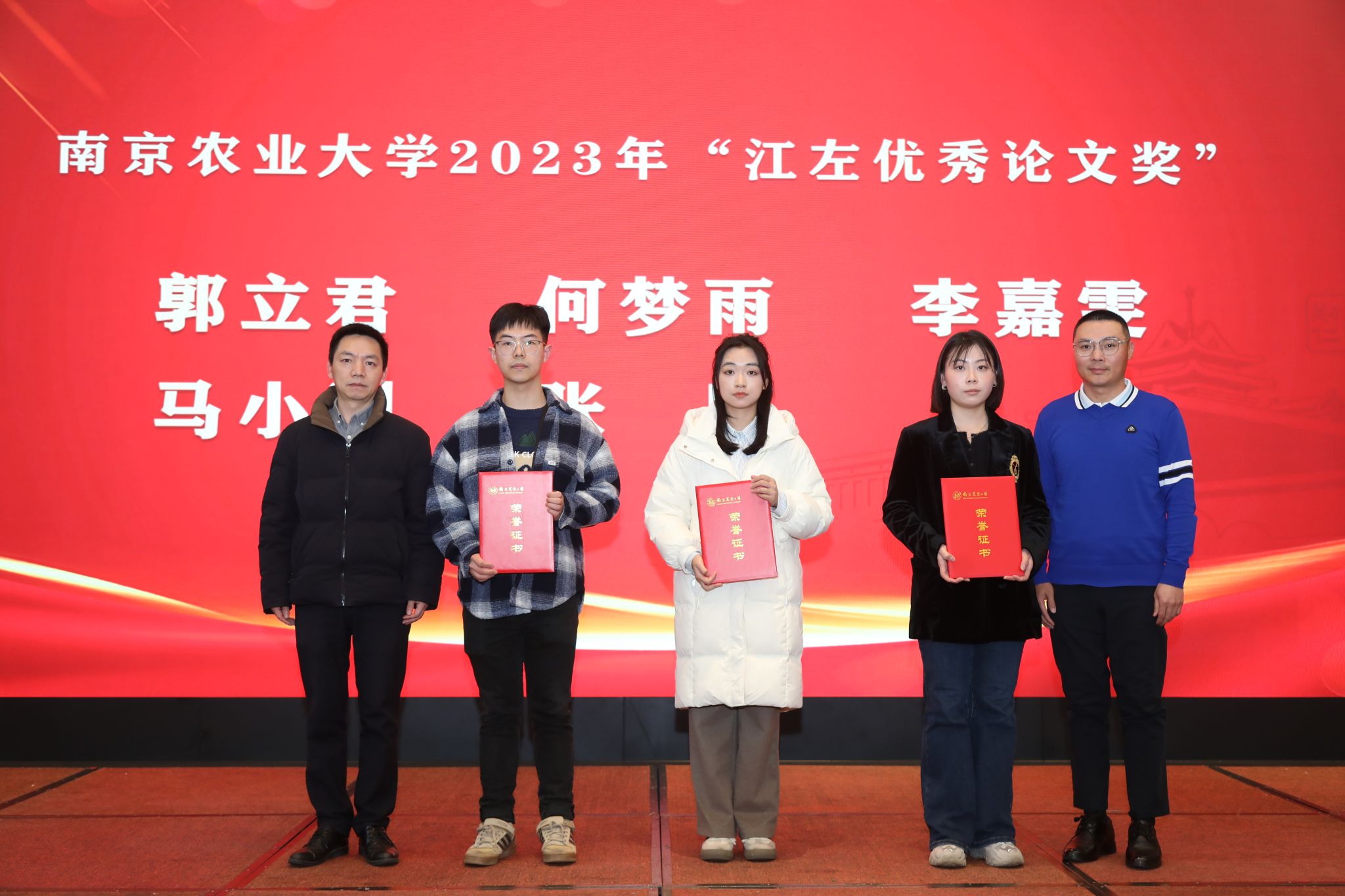 江苏省农业科学院党委书记、院长易中懿,江苏社科名家、校“钟山学者”特聘教授钟甫宁共同为学院获2022-2023学年国家奖学金学生颁奖。