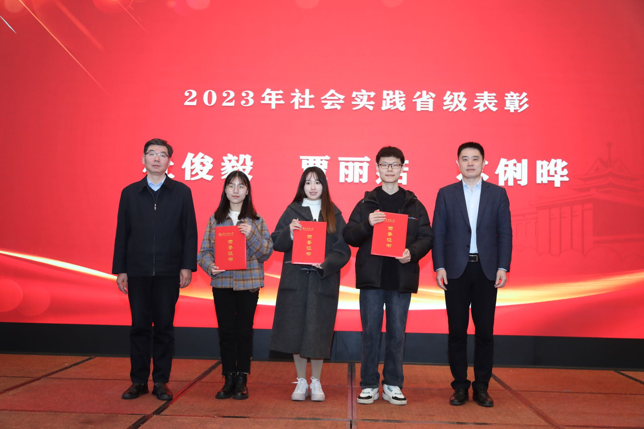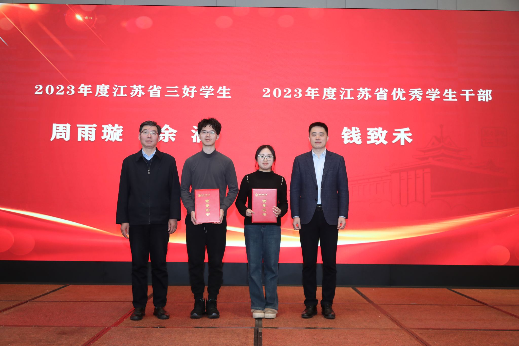 江苏省政府研究室原副主任臧建东、院党委书记孙雪峰共同为学院荣获2023年度江苏省三好学生、江苏省优秀学生干部、2023年度江苏省社会实践先进个人和优秀社会实践报告等称号学生颁奖。