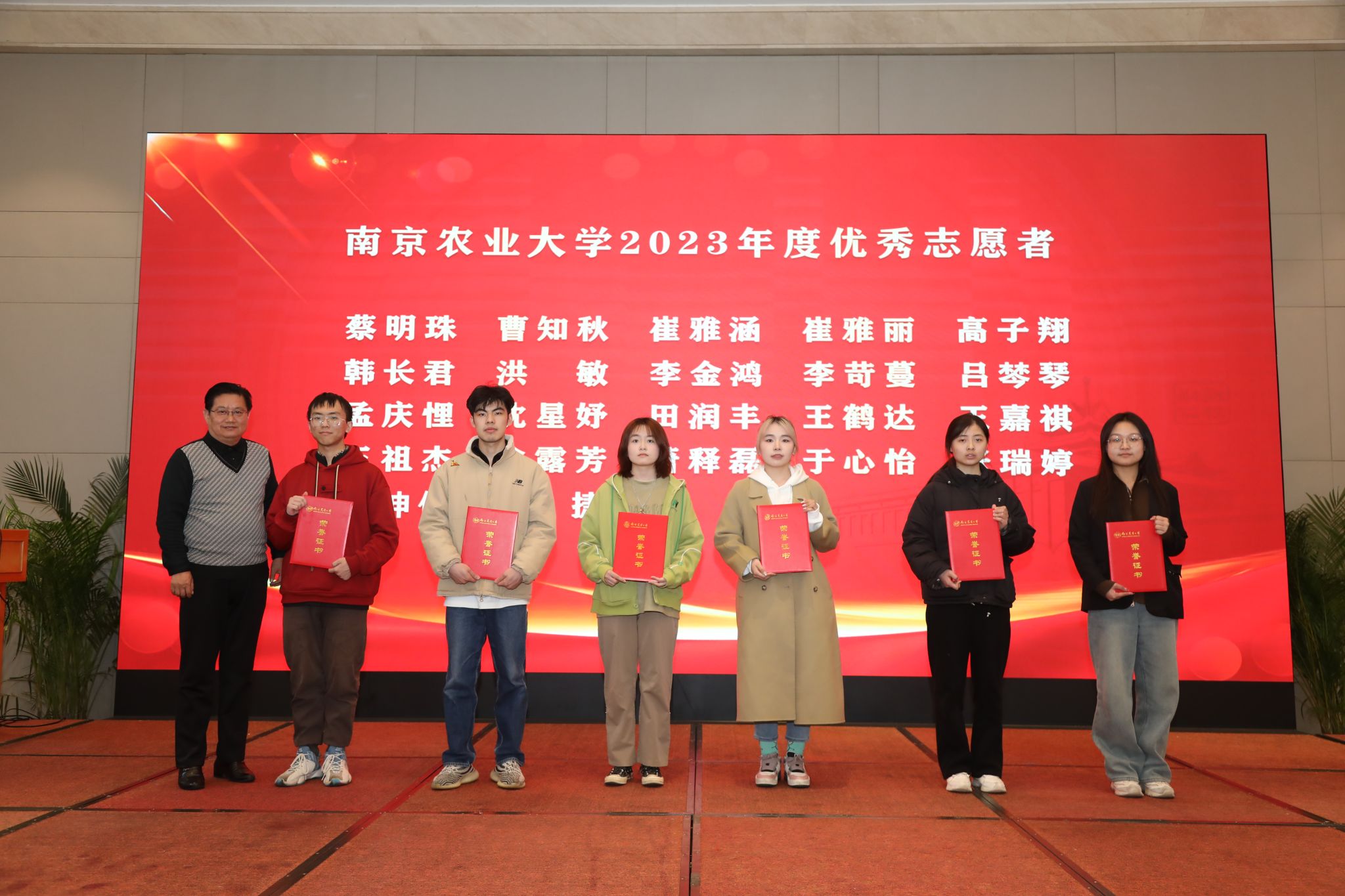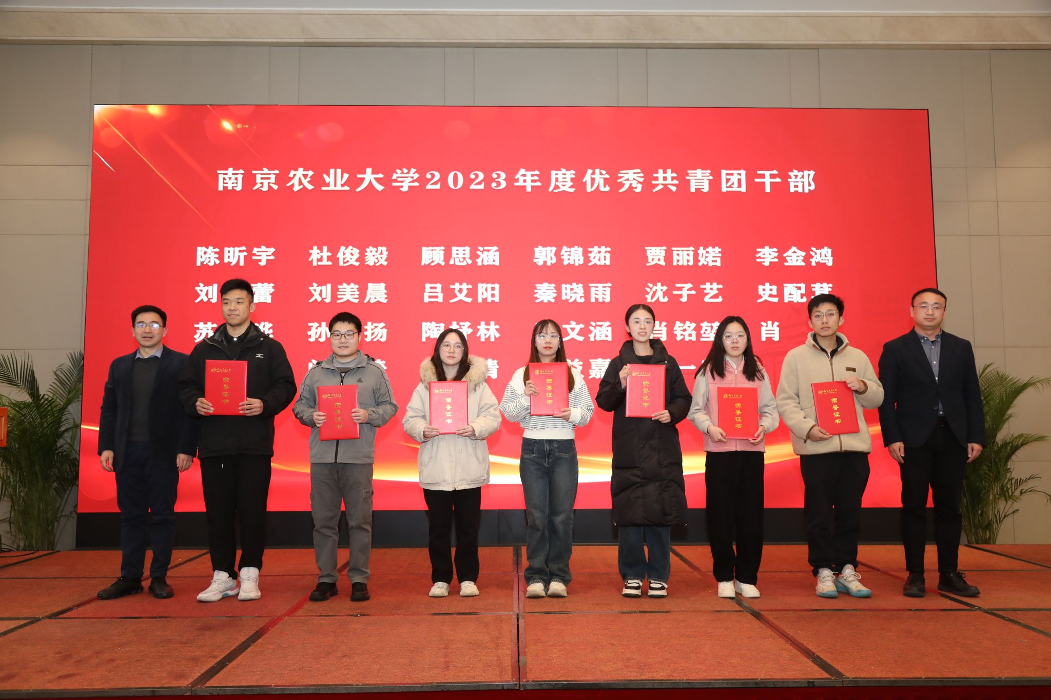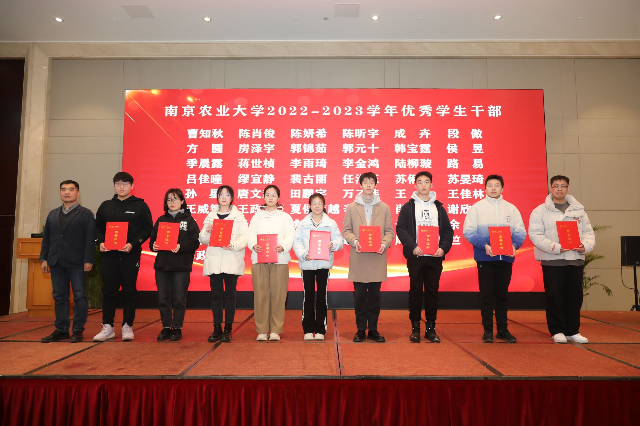 扬州大学党委常委、副校长蒋乃华,院长徐志刚共同为荣获beat365正版唯一官方网站2022-2023学年大北农青年学子校长奖励金、第六届“瑞华杯”beat365正版唯一官方网站最具影响力学生的学院学生颁奖。