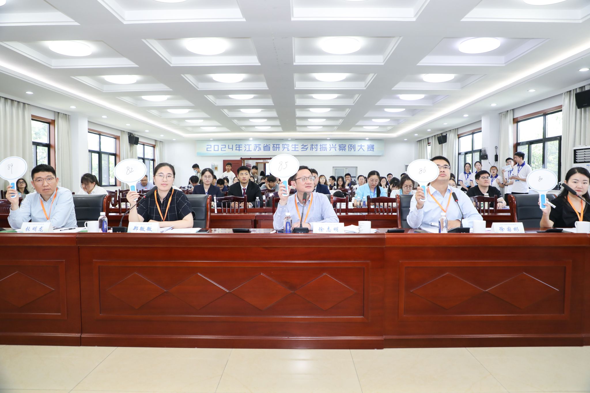 江苏省农产品加工标准化技术委员会主任姜雪忠、江苏省农业科学院经济作物研究所副所长胡茂龙、江苏省农业科学院农产品质量安全与营养研究所副所长张志勇、江苏省淡水水产研究所研究员黄鸿兵、太仓市畜牧兽医站站长魏宗友担任大赛自科组评委。江苏省社会科学院农村发展研究所所长徐志明、江苏省农村经济研究中心副主任徐国彬、江苏省农业科学院农业经济与发展研究所副所长郑微微、乡村干部报总编助理车婧、江苏省蟹联网科技有限公司总经理张明龙担任大赛社科组评委。评委们分别从案例文本的撰写、汇报演示和回答问题的现场表现、PPT 制作、团队合作与整体效果、案例应用推广、研究生实践参与几个方面对各团队进行综合评分。