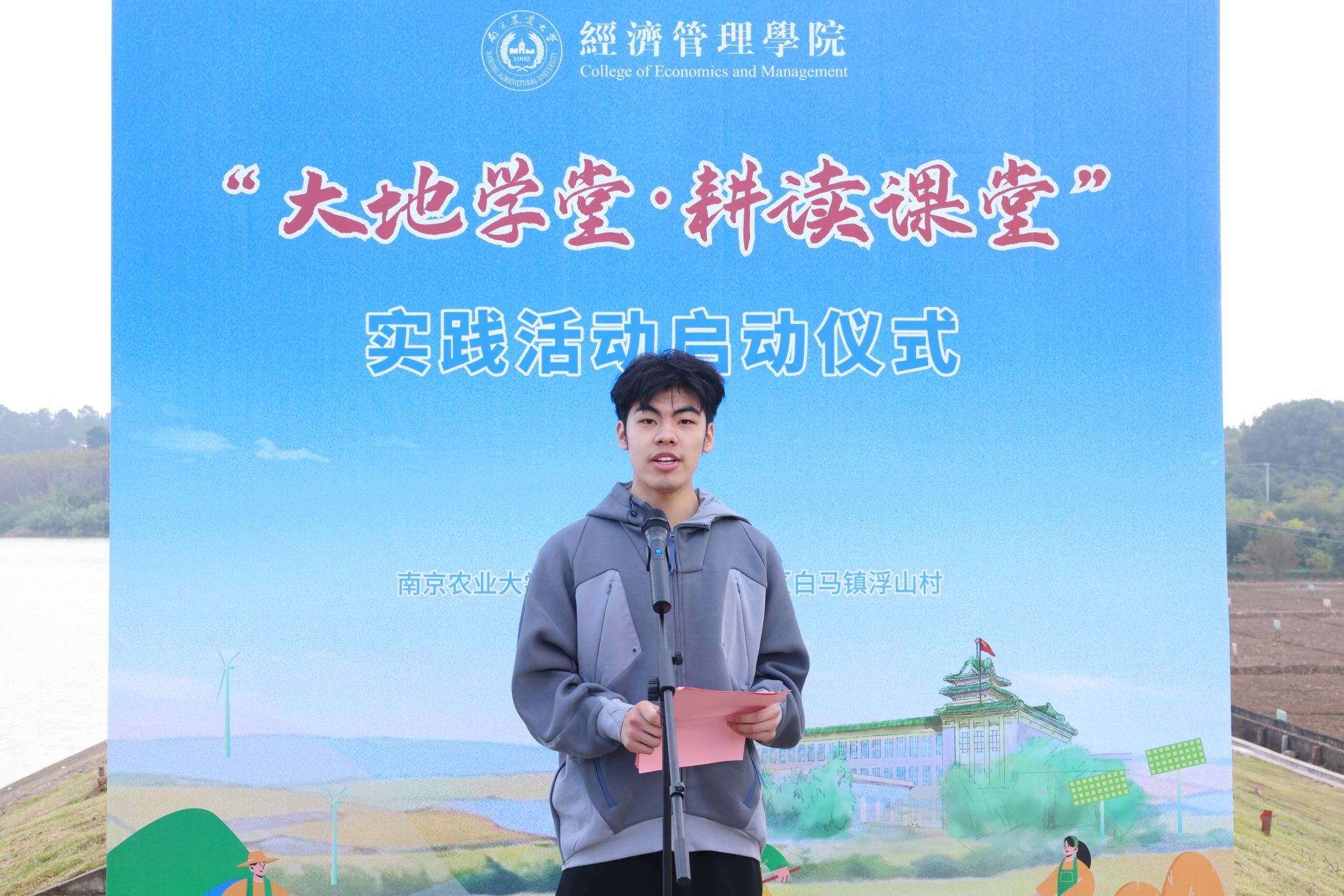 白马高新区党工委副书记、白马镇党委书记崔长龙,管委会财政管理局局长刘源宝,管委会科技人才局副局长朱韩峰,白马镇党委委员章祥兵,浮山村党总支书记曹安静,浮山村驻村第一书记廖利华,beat365正版唯一官方网站党委书记孙雪峰,副书记张树峰,农经系系主任展进涛出席启动仪式,学院本科生班主任、青年教师和辅导员代表、农经系2022级全体本科生共140余人参加了本次活动。