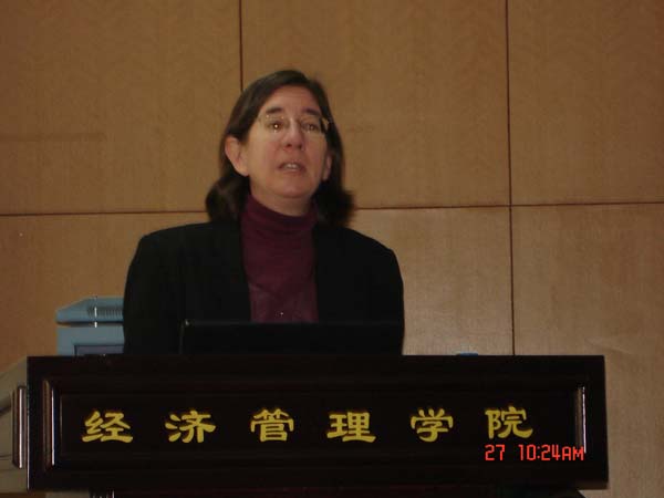 报告题为:Enterprise privatization,local government finance,and the provision of public goods in rural China.此次报告是专门针对硕博士研究生的,报告的模型中引入了Primary teacher/student ratio ,Primary school completion (graduation)rate,Middle school conpletion (graduation)rate ,Primary to middle school continuation rate ,senior centers per elderly(over age 65),senior patients per elderly (over age 65),Township hospital per capita,Township hospital staff per capita,Real per capita social relief expenditures,Real per capita poverty relief expenditures,Real per capita natural disaster relief exprnditures等变量,介绍了中国某些省市公共财政、社会服务、经济增长之间的相互关系,讲解清楚,深入浅出,并详细回答了各种问题,对同学们从事相关研究有很大的启发。来听该报告的除了硕博士研究生,还有许多老师。钟甫宁老师对报告作了总结。