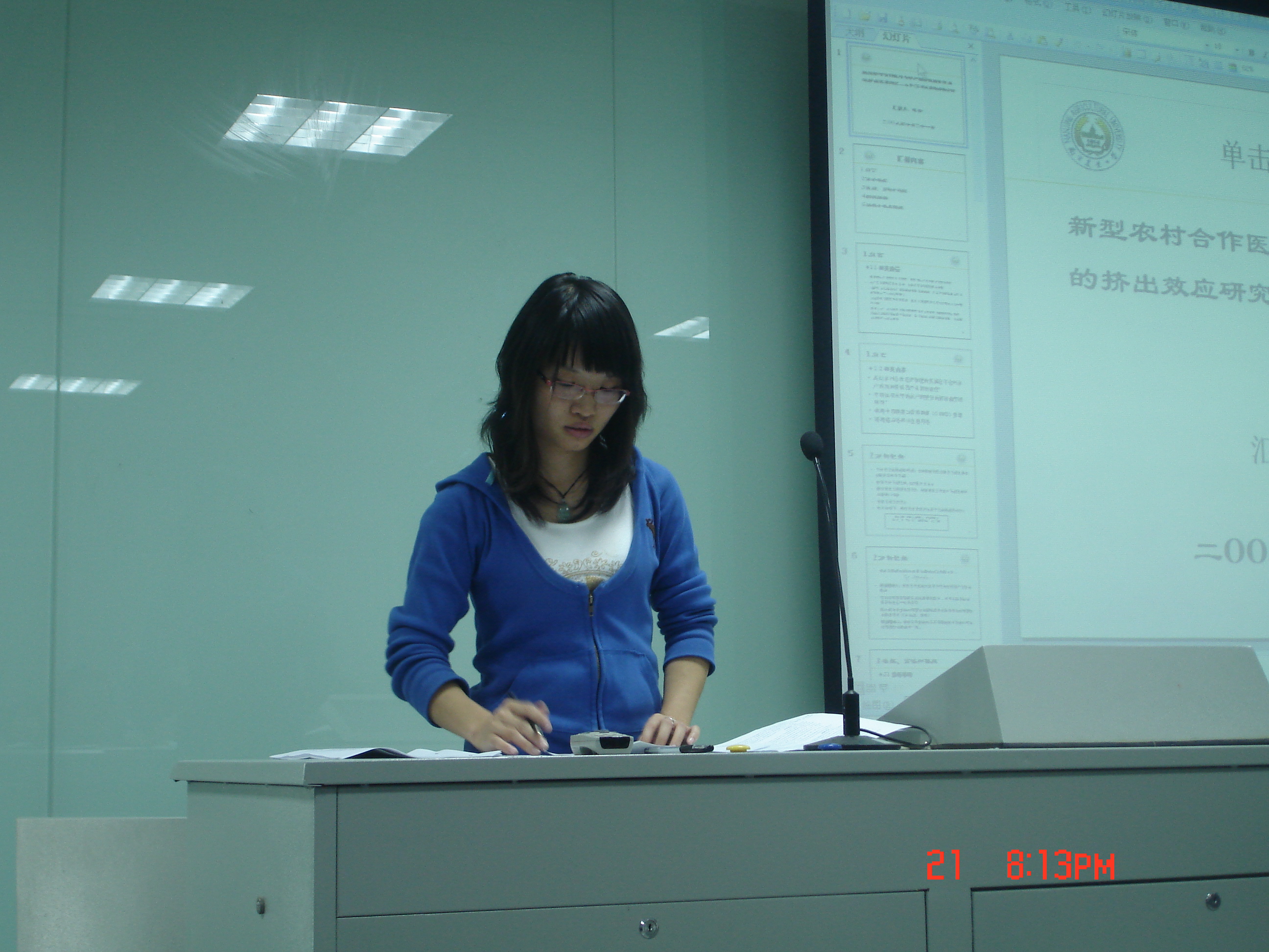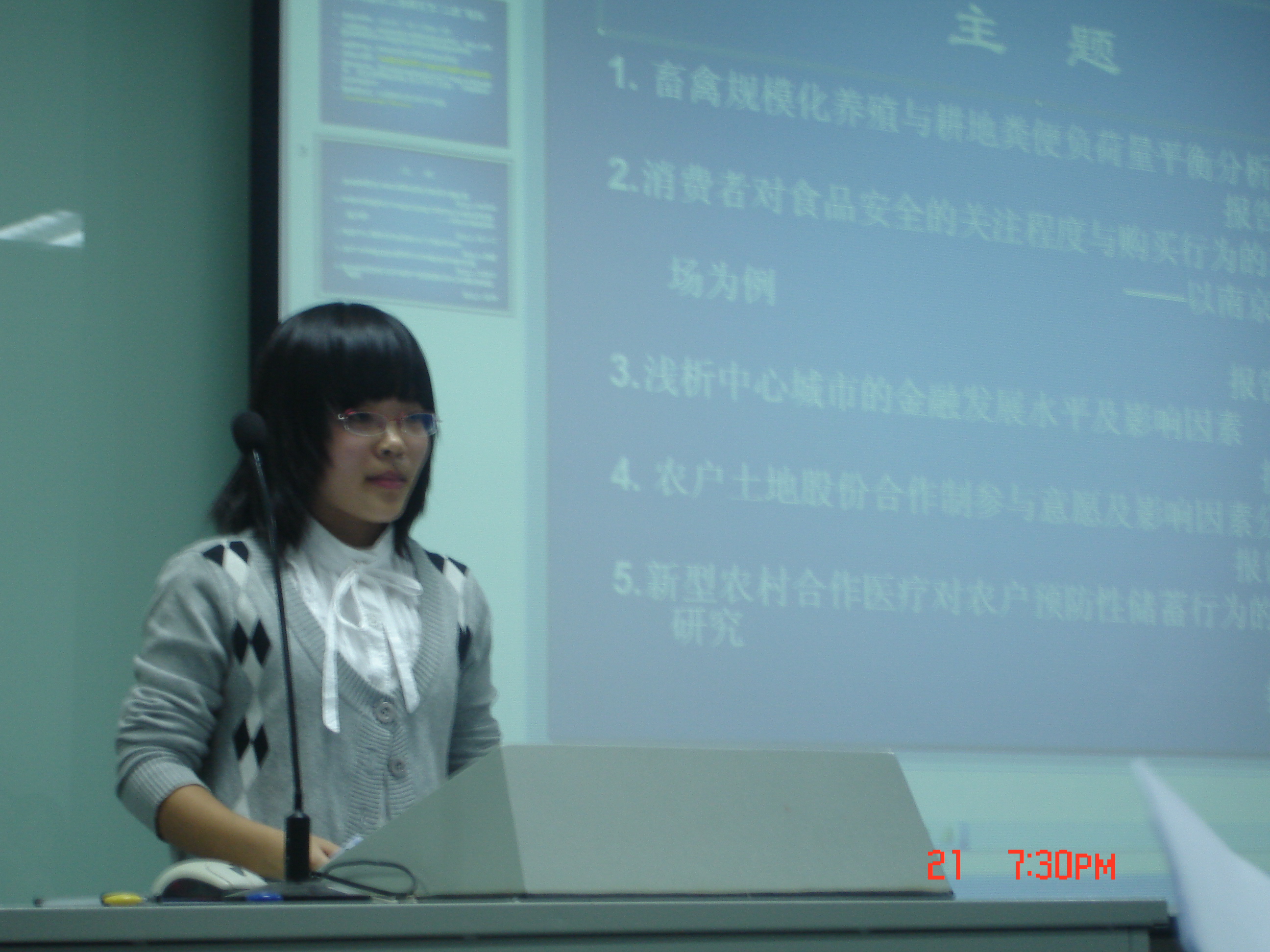 在本次报告中,首先,郭利京博士深入浅出地报告了《畜禽规模化养殖与耕地粪便负荷量平衡分析》,紧接着易小兰博士利用问卷调查、回归模型等方式进行了研究,精彩地向大家展示了自己的研究成果——《消费者对食品安全的关注程度与购买行为的差异分析——以南京市蔬菜市场为例》,然后莫媛博士通过建立指标体系等一系列方法做了研究,引人入胜地做了《浅析中心城市的金融发展水平及影响因素》的报告。接下来,朱新华博士做了《农户土地股份合作制参与愿意及影响因素分析》的报告。最后潘丹博士做了与“三农”密切联系的《新型农村合作医疗对农户预防性储蓄行为的挤出效应研究》的报告。