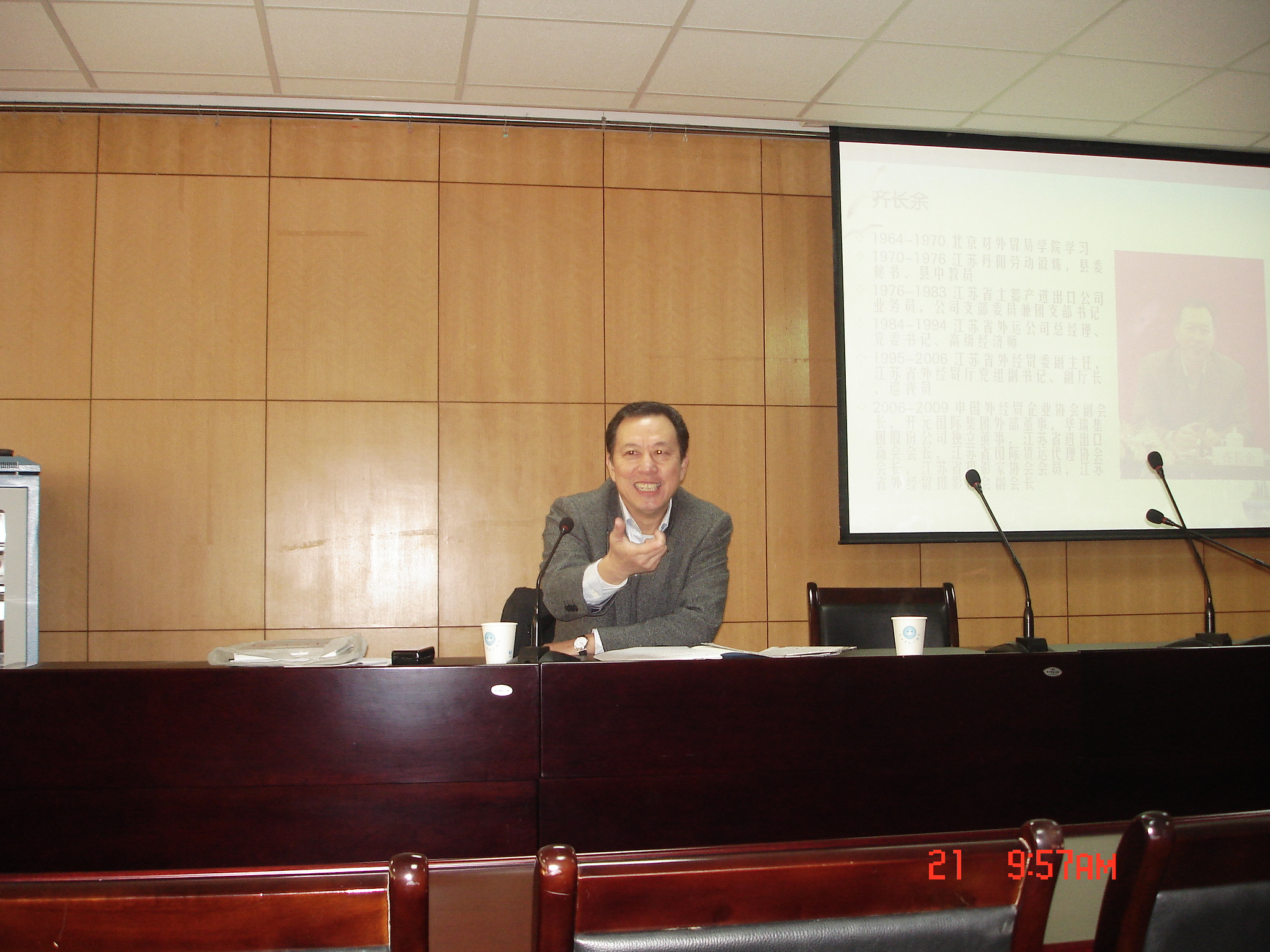 齐长余会长首先分析了我国对外贸易的发展趋势,他以今年秋季广交会外贸有所回暖为例,认为在当前经济危机的情况下,我国的对外贸易稳中有升,他认为对外贸易形势的根本改变在于外部市场的回暖。接着,他介绍了江苏省对外贸易的发展:1974年江苏省对外开放口岸;1978年党的十一届三中全会到1990年是江苏经济国际化的起步阶段;1990-2001年是江苏经济国际化的加快发展阶段;2001年加入WTO后是江苏经济国际化的全面提升阶段。然后,齐长余会长给同学们介绍了国贸专业的前景,他认为国贸岗位大有可为,外贸需要人才;认为国贸岗位是改革开放的前沿,贸技工的龙头;是竞争性很强的工作;其接触面广,交往人多,对知识和技能要求很高。最后他鼓励同学们要认真刻苦学习,打好扎实基础;做事先学会做人;从小事做起,从基础做起;乐观对待现实,坚信美好未来;培养广泛兴趣,丰富快乐生活。
