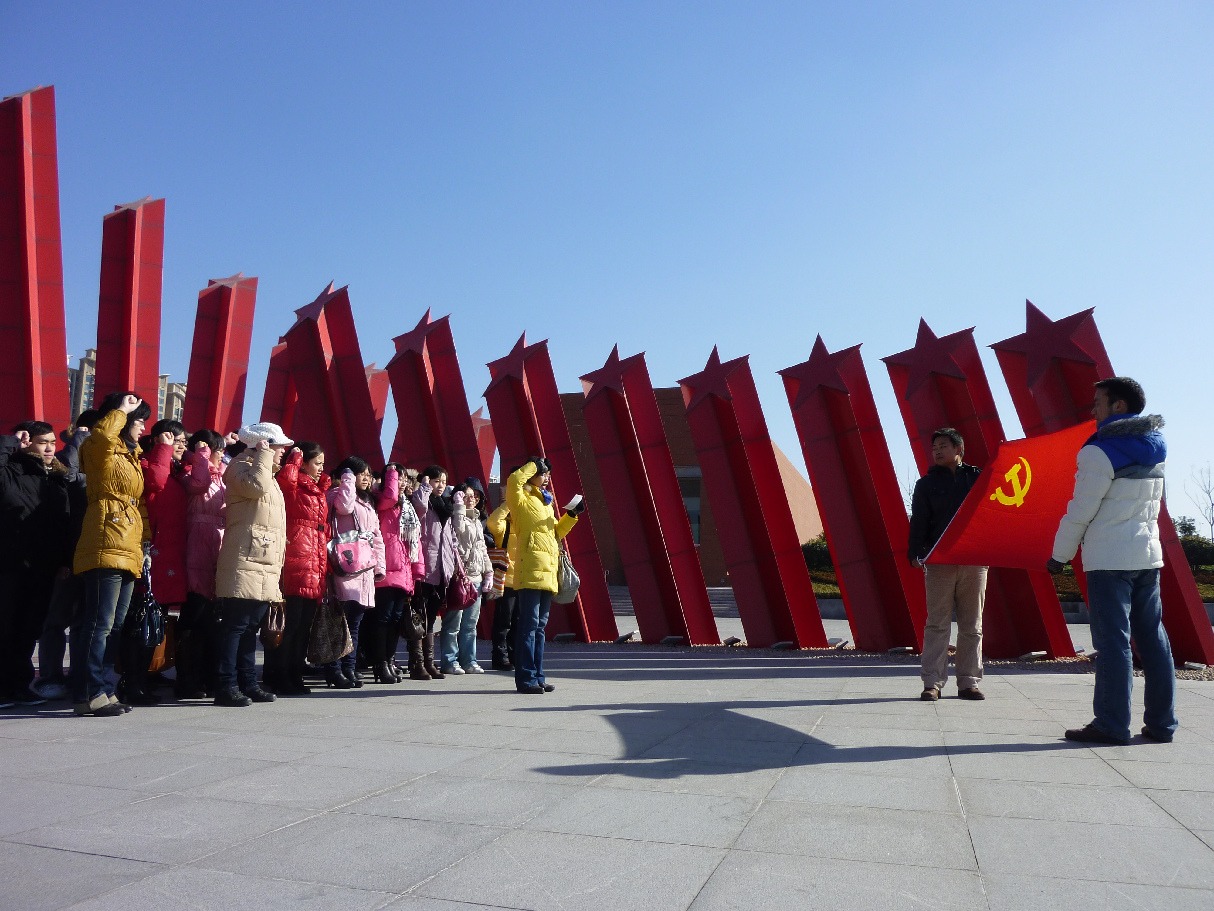 上午8:30准时出发,经过半个多小时的车程,党员们来到见证南京解放战争历史的南京渡江胜利纪念馆。一到目的地,一幢庄严肃穆的建筑映入大家的眼帘,巍峨壮美,气势非凡。党员们立刻为之鼓舞,不顾南京深冬异常冷冽的寒风,飞奔下车,迫不及待地踏上这一片红色热土。