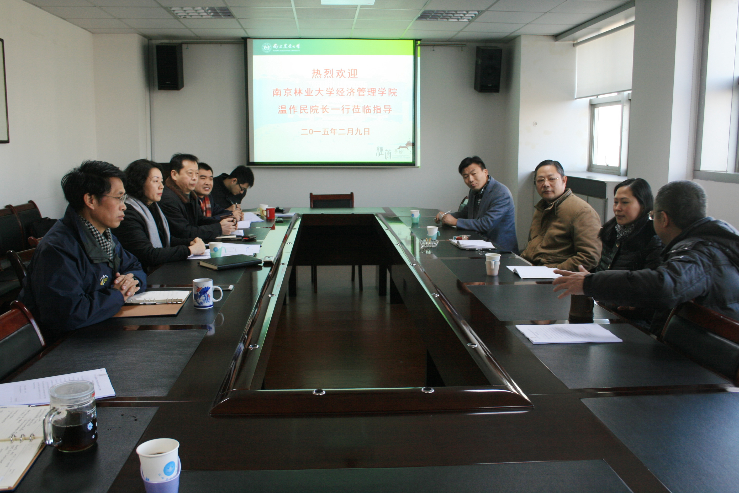 2015年2月9日,南京林业大学经管学院院长温作民、党委书记高晓琴、副书记刘子超等一行来beat365官网交流学科建设事宜。beat365官网党政领导班子、钟甫宁教授、孙顶强副教授等参加了交流会。