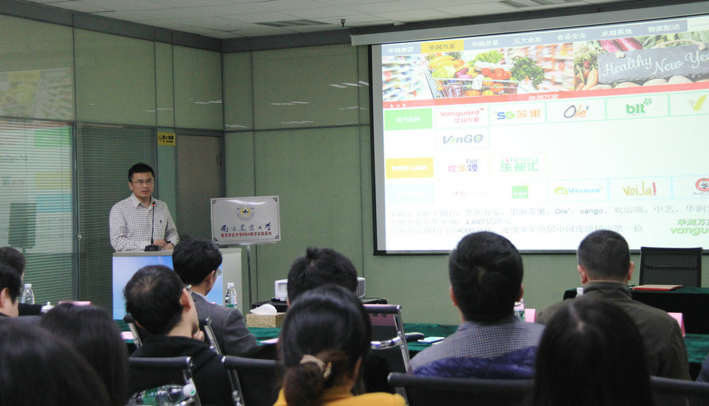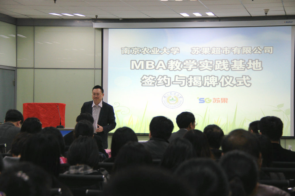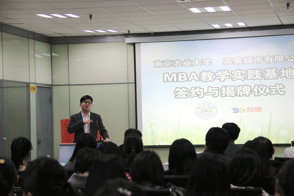 随后,苏果超市股份有限公司张永明副总经理介绍了苏果超市有限公司的基本情况,表示苏果集团在快速发展的过程中,深刻体会到“人”的重要性,实践基地的建立为苏果日后引进高端人才和创新企业管理理念提供了有利的条件,将会极大地促进苏果的发展。他希望beat365正版唯一官方网站的师资力量能为苏果的发展提供人才保障和智力支持,同时表示将创造良好的环境,对实践基地的建设提供支持。张总希望通过本次合作,让南农大MBA走进苏果、了解苏果,锻炼学员们认识与解决实际问题的能力。
