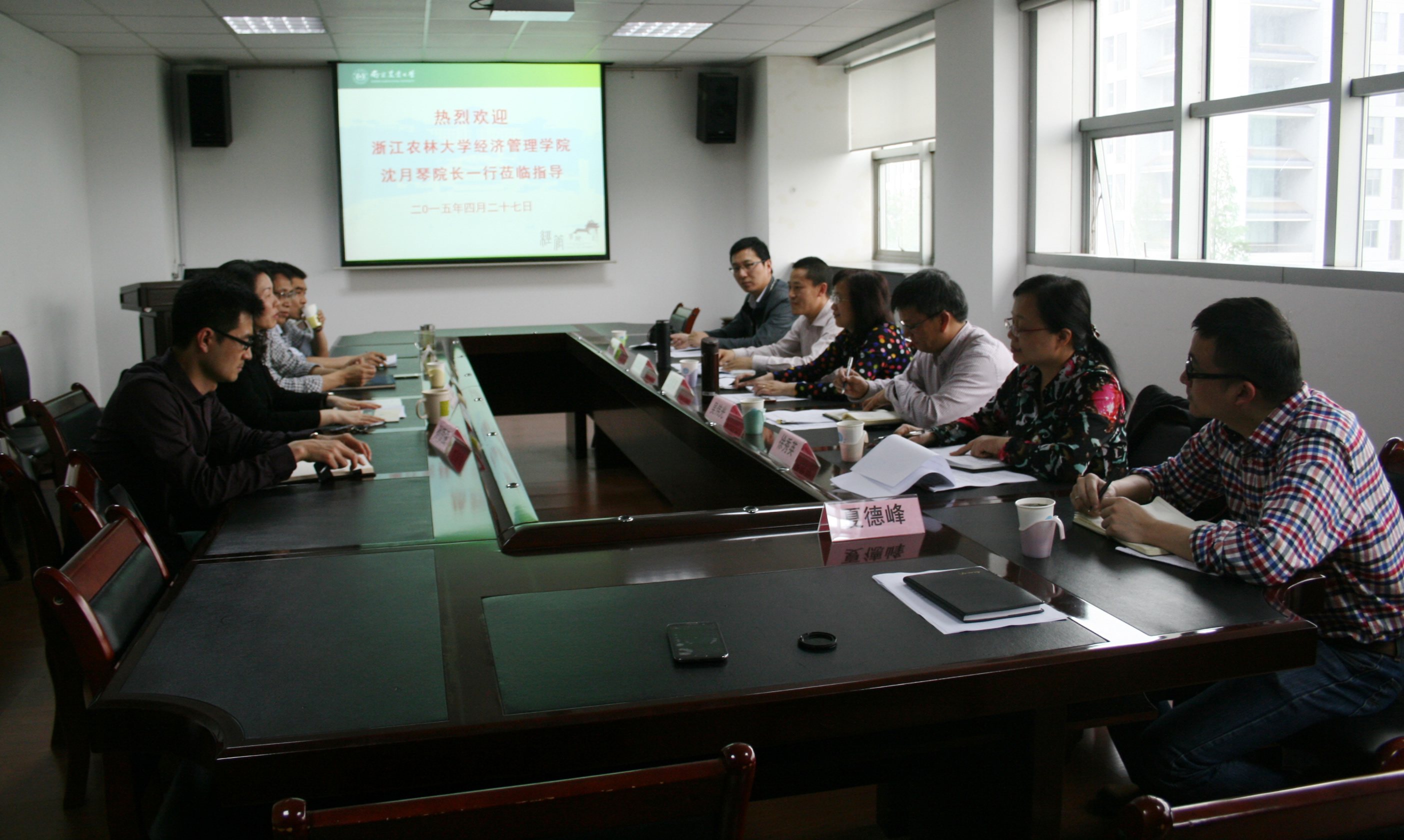 2015年4月27日,浙江农林大学经管学院院长沈月琴、副院长吴伟光、陈劲松等一行6人来beat365官网考察交流。学院院长朱晶、副院长应瑞瑶、耿献辉,孙顶强副教授等参加了交流会。