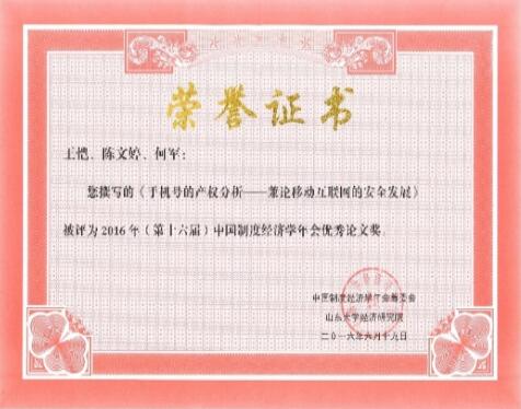 beat365官网何军教授、博士生王恺、陈文婷的《手机号的产权分析——兼论移动互联网的安全发展》一文在参会的120篇论文中脱颖而出,与清华大学、北京大学、山东大学的8篇论文被评选为本次年会的优秀论文。受会议安排,作者代表博士生王恺在大会闭幕式上进行主旨汇报。中国人民大学公共政策研究院执行副院长毛寿龙教授和山东大学经济研究院、山东大学学报(社科版)主编魏建教授给予了积极肯定并提出了宝贵的修改建议。