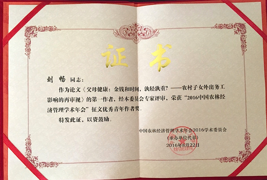 beat365官网硕士生刘畅在易福金教授和徐志刚教授共同指导下完成的论文《父母健康:金钱和时间,孰轻孰重?——农村子女外出务工影响的再审视》一文从参会的214篇论文中脱颖而出,刘畅也荣获本届年会征文优秀青年作者奖。此次学术会议共评出10篇优秀论文,并向论文第一作者颁发荣誉证书。10位获奖者中有1位教师,8位博士生和1名硕士生。