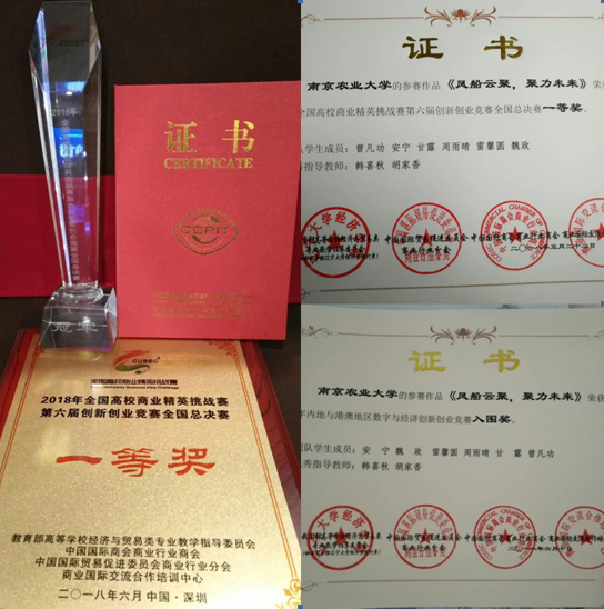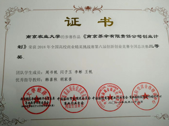 6月8日-10日,2018年全国高校商业精英挑战赛第六届创新创业竞赛在广东省深圳市成功举办。本次竞赛是由教育部高等学校经济与贸易类专业教学指导委员会、中国国际商会商业行业商会、中国国际贸易促进委员会商业行业分会、(国资委)商业国际交流合作培训中心,中国国际贸易促进委员会商业行业分会、(国资委)商业国际交流合作培训中心承办。beat365官网教师韩喜秋和胡家香带领来自农林经济管理、国际经济与贸易和工商管理等专业的本科学生共计8人参加此次比赛,经过激烈角逐,创业组项目《风船云聚,聚力未来》从12组队伍中脱颖而出,斩获总决赛金奖,获得一万五千元奖金,同时取得代表内地参加2018年10月在香港举办的“内地与港澳地区数字与经济创新创业竞赛”的参赛资格。另外,本院提交的参赛方案《南京苏伞有限责任公司创业计划》获创客组全国二等奖。