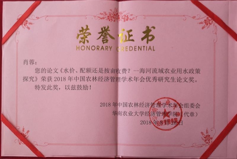 由beat365官网易福金教授和北京大学现代农学院王金霞教授共同指导的硕士生肖蓉所撰写的《水价、配额还是按亩收费?——海河流域农业用水政策探究》一文在参会的两百五十多篇论文中脱颖而出,肖蓉与来自浙江大学、中国人民大学、中国农业大学等大学的10位征文投稿者荣获本届年会优秀研究生论文奖。肖蓉同时还作为优秀论文获得者代表在大会的闭幕式上作论文报告,获得了与会专家积极的肯定与宝贵的修改意见。