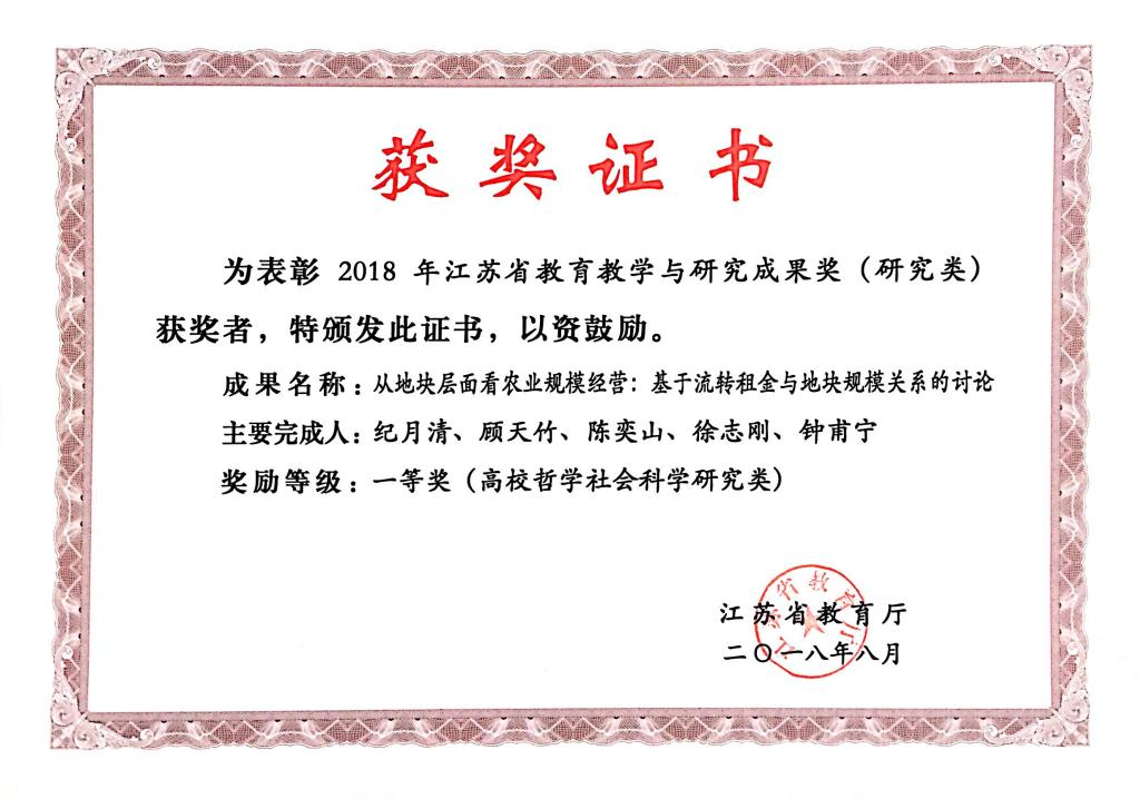 近日,江苏省教育厅发布了《省教育厅关于公布2018年江苏省教育教学与研究成果奖(研究类)获奖项目名单的通知》(苏教人﹝2018﹞10号),学院纪月清教授主持完成的成果获江苏省教育科学研究成果奖(高校哲学社会科学研究类)一等奖。