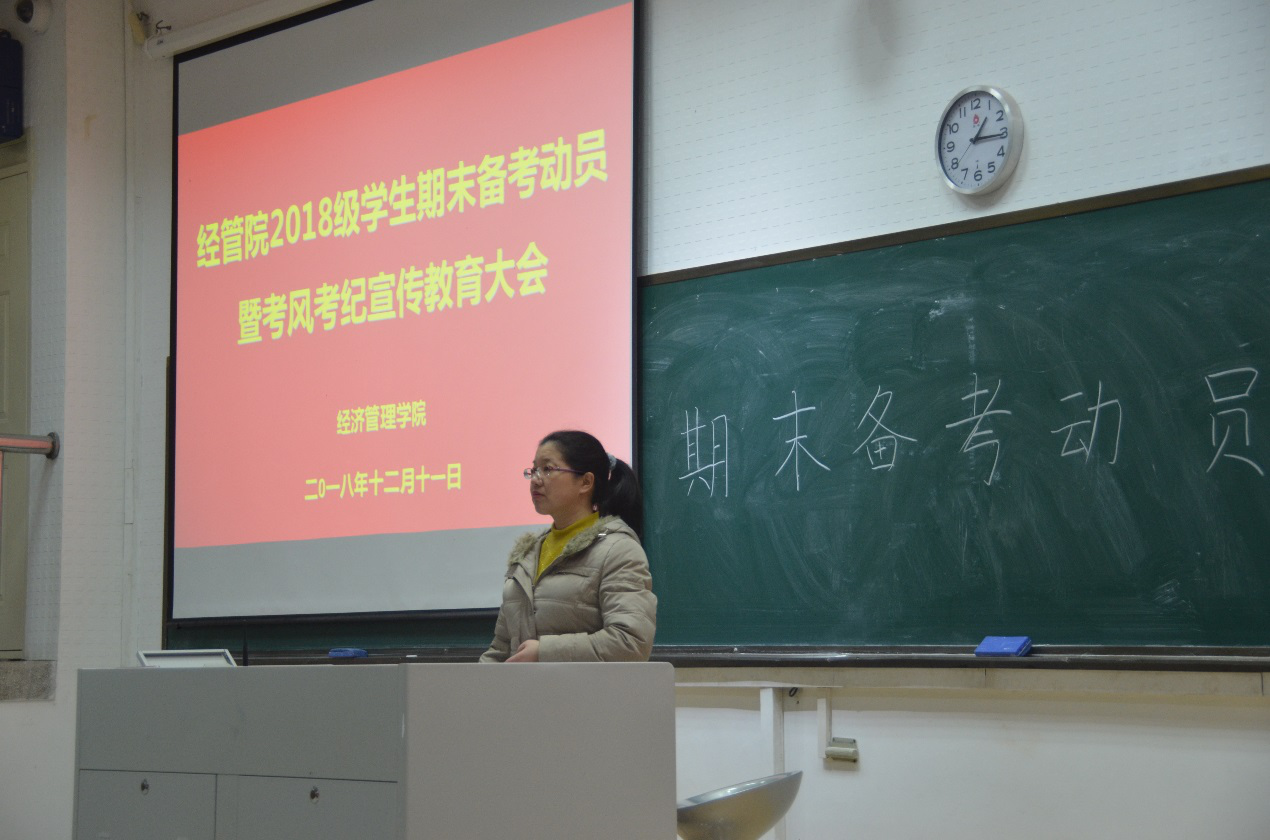 2018年12月11日,beat365正版唯一官方网站2018级学生期末备考动员暨考风考纪宣传教育大会在教学楼C201举行。beat365正版唯一官方网站党委副书记卢忠菊、本科生辅导员郑琼婷出席会议。beat365正版唯一官方网站全体2018级本科生参加大会。