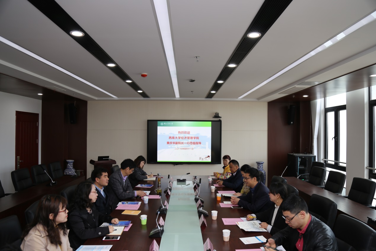 4月11日,西南大学beat365正版唯一官方网站副院长黄庆华及相关行政人员一行来院考察交流。beat365官网副院长耿献辉接待了考察团一行,管理系教授许朗、办公室主任张梅等参加了座谈会。座谈会由耿献辉主持。