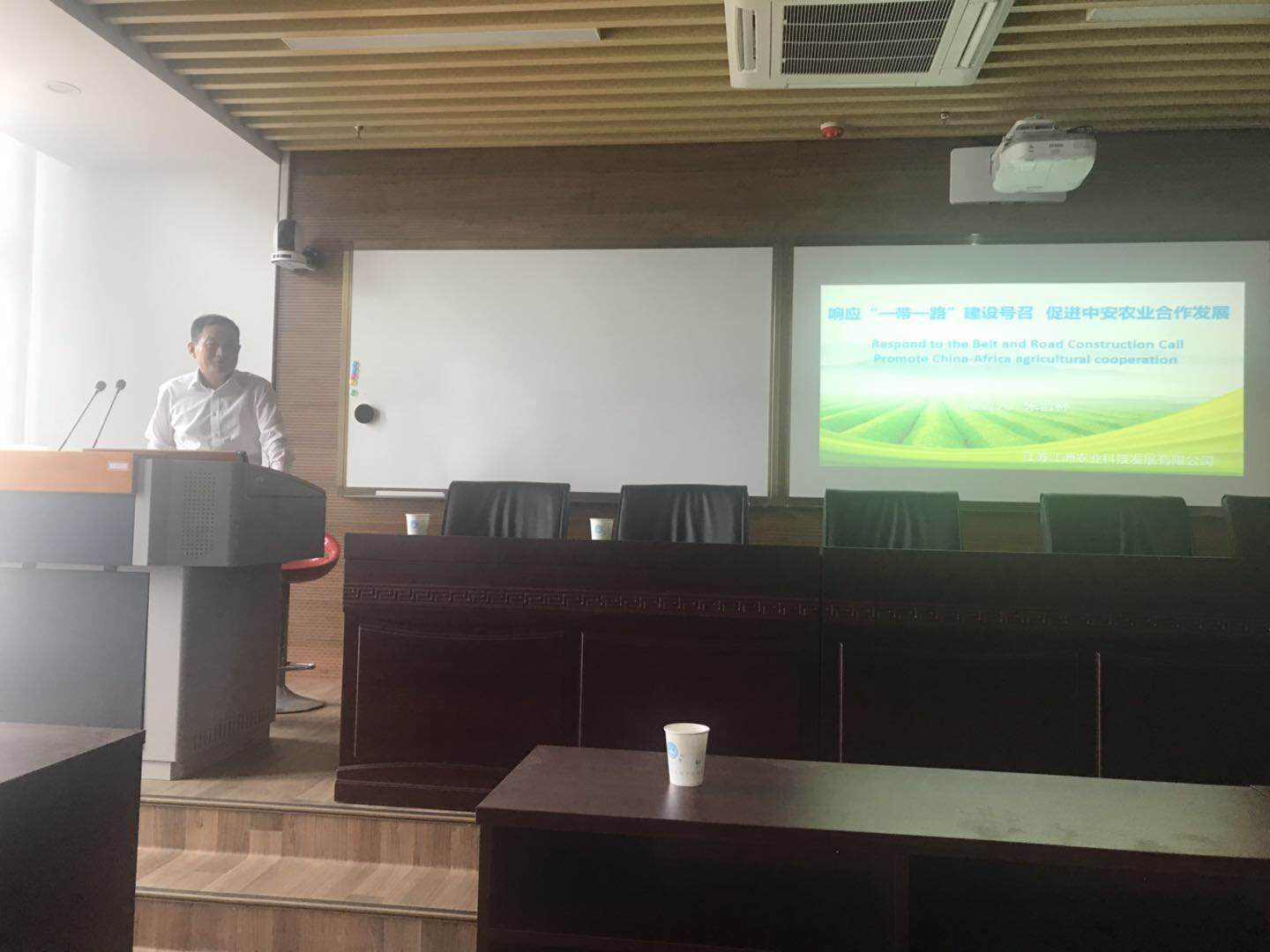 朱晋林董事长首先介绍了安哥拉农业的概况,紧接着介绍了公司在安哥拉的发展,公司的投资和发展得到了两国政府的大力扶持,今年公司投资了200万美元建设全自动化日处理200吨的粮食烘干系统和存储6000吨的粮食筒仓及成品库房,农场的建设成果得到安哥拉各界的高度评价,安哥拉农业部部长、商务部部长、万博省省长曾先后多次亲临农场观摩指导,万博农场项目入选省“一带一路”重点项目库。公司与江苏牧院、江苏农科院、广西农科院等科研单位建立了友好合作关系。