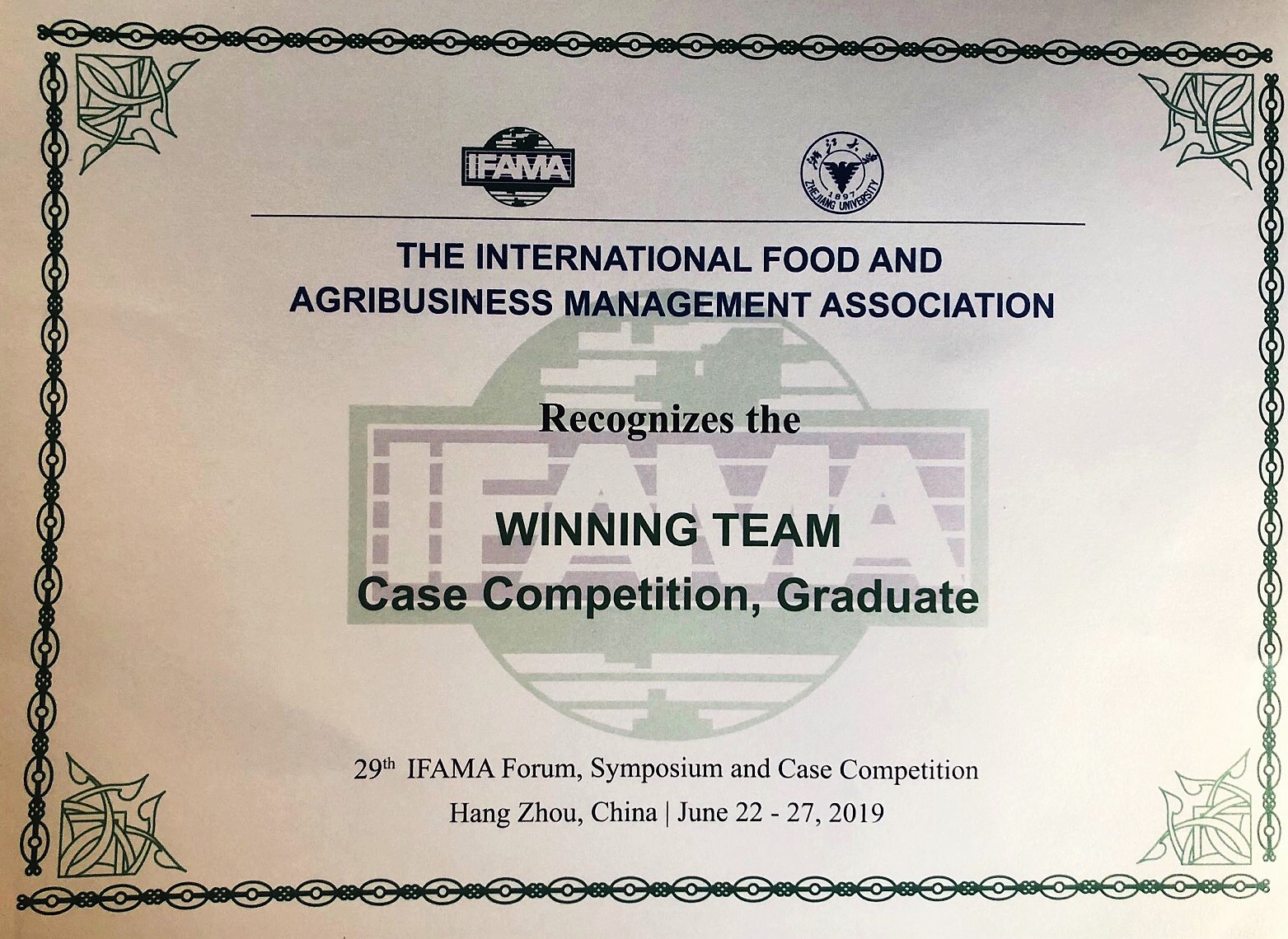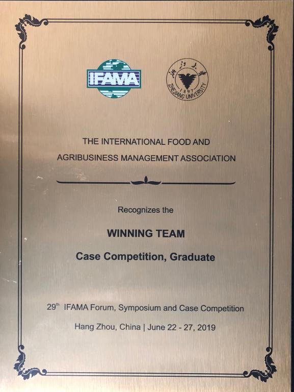 国际食品与农业企业管理协会(International Food and Agribusiness Association,简称IFAMA)第29届年度论坛与研讨会于6月22日至26日在中国杭州举行。在今年的国际学生案例竞赛中,beat365正版唯一官方网站派出由蔡忠州教授和朱战国教授指导并带队的12位同学共三支队伍参赛,其中王喆琳、石颖、冯颖、曹嘉彦组成的代表队,与来自普渡大学、密歇根州立大学等国际知名高校的21支代表队同场竞技,勇夺研究生组冠军!这是继2012年夺冠后,南农经管学子时隔七年,再次登上最高领奖台!