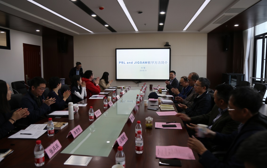 何军教授做题为《PBL and JIGSAW教学方法简介》的专题报告。报告从问题导向教学法和拼图教学法的优势说起,讨论了两种教学法对于摒弃传统教学方式的弊端、提升学生课堂参与度与优化教学效果等方面的积极意义。