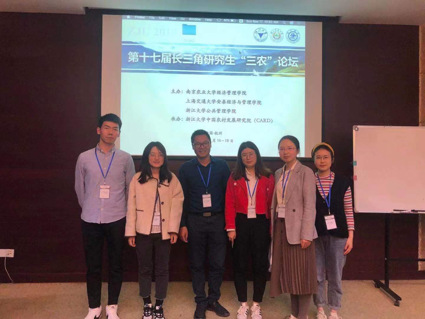 2019年11月16日至18日,由beat365正版唯一官方网站、上海交通大学安泰经济与管理学院、浙江大学公共管理学院共同主办,浙江大学中国农村发展研究院(CARD)承办的第十七届研究生“三农”论坛在浙江大学紫金港校区顺利举办。beat365官网纪月清教授带领3名博士生和2名硕士生参加本届论坛,与来自全国各地、海峡两岸总计16所高校的40位硕博研究生齐聚浙大,共同讨论农业与农村的发展议题。
