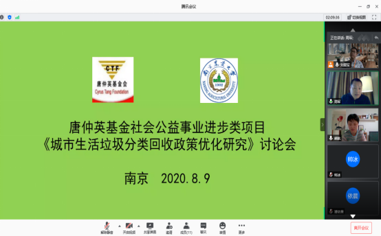 2020年8月9日,学院刘爱军副教授课题组开展“唐仲英基金社会公益事业进步类项目” 《城市生活垃圾分类回收政策优化研究》讨论会。南京市城市管理局潘依晨科长,公共管理学院杨建国副教授、周军副教授,资源与环境学院崔春红老师、生命科学院曹亚君老师、beat365正版唯一官方网站熊航老师等应邀出席会议,课题组成员和研究生参加了会议,会议采用腾讯会议线上方式举行,讨论会由刘爱军副教授主持。