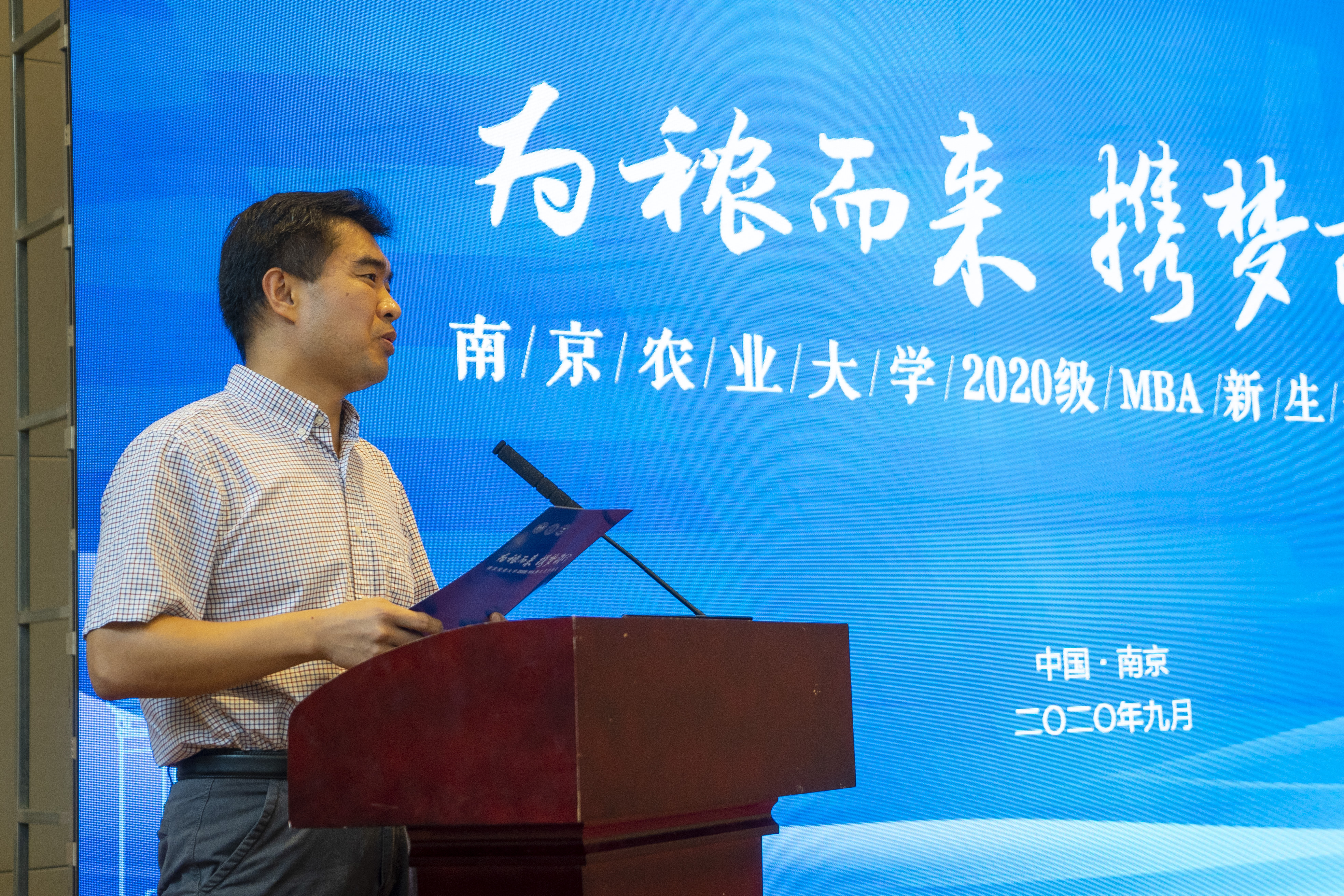 姚志友部长代表校研究生院欢迎2020级新生来到南农。他从学校办学历史起源出发,简要介绍学校基本情况及研究生教育的发展历程,他指出,MBA学习要与学员自身的职业发展有机衔接,注重培养自身的分析能力、创新能力、表达能力和职业素养,他对全体2020级MBA新生提出殷切希望:主动学习、完善自我、追求卓越;恪守“诚朴勤仁”的校训精神;协调好工作和学习的关系;严于律己,宽以待人,注重培养合作精神;保持高度的社会责任感,把实现自身价值与服务社会结合起来,积极参与社会实践。