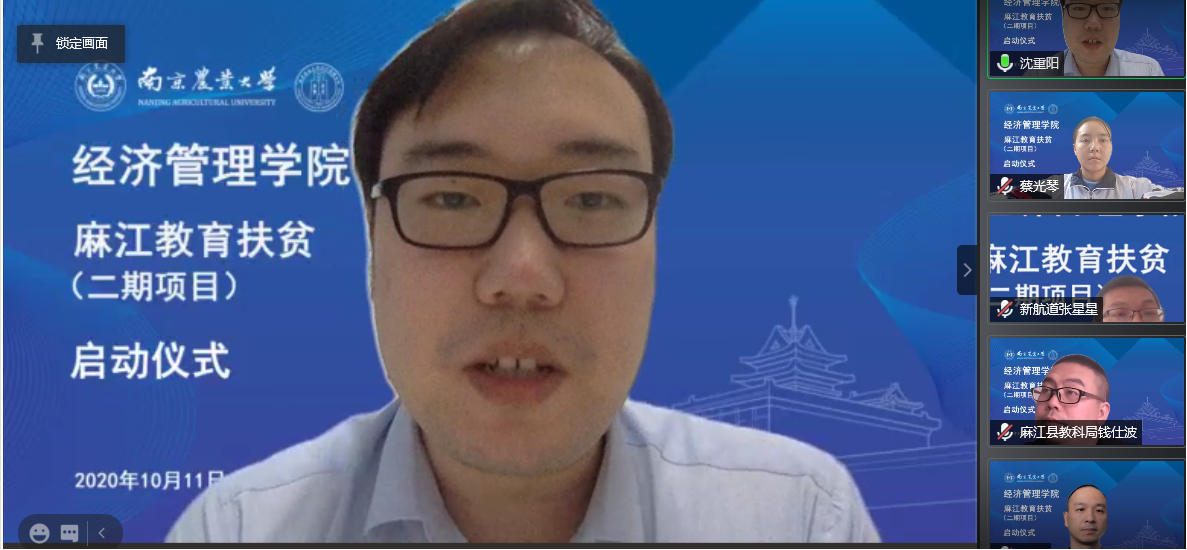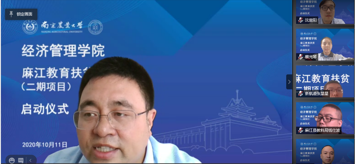 2020年10月11日,beat365正版唯一官方网站、麻江县委、麻江教科局、新航道教育集团举行了“六次方”教育扶贫(二期项目)线上启动仪式,麻江县县委常委、副县长李玉清、麻江县教科局党组成员、副局长钱仕波、麻江县教科局党组成员、县教师培训中心主任陈绍举主任、新航道教育集团南京分校校长沈重阳、南农经管院党委副书记宋俊峰、南农经管院教授经贸党支部书记周力教授参会并做了主旨发言。